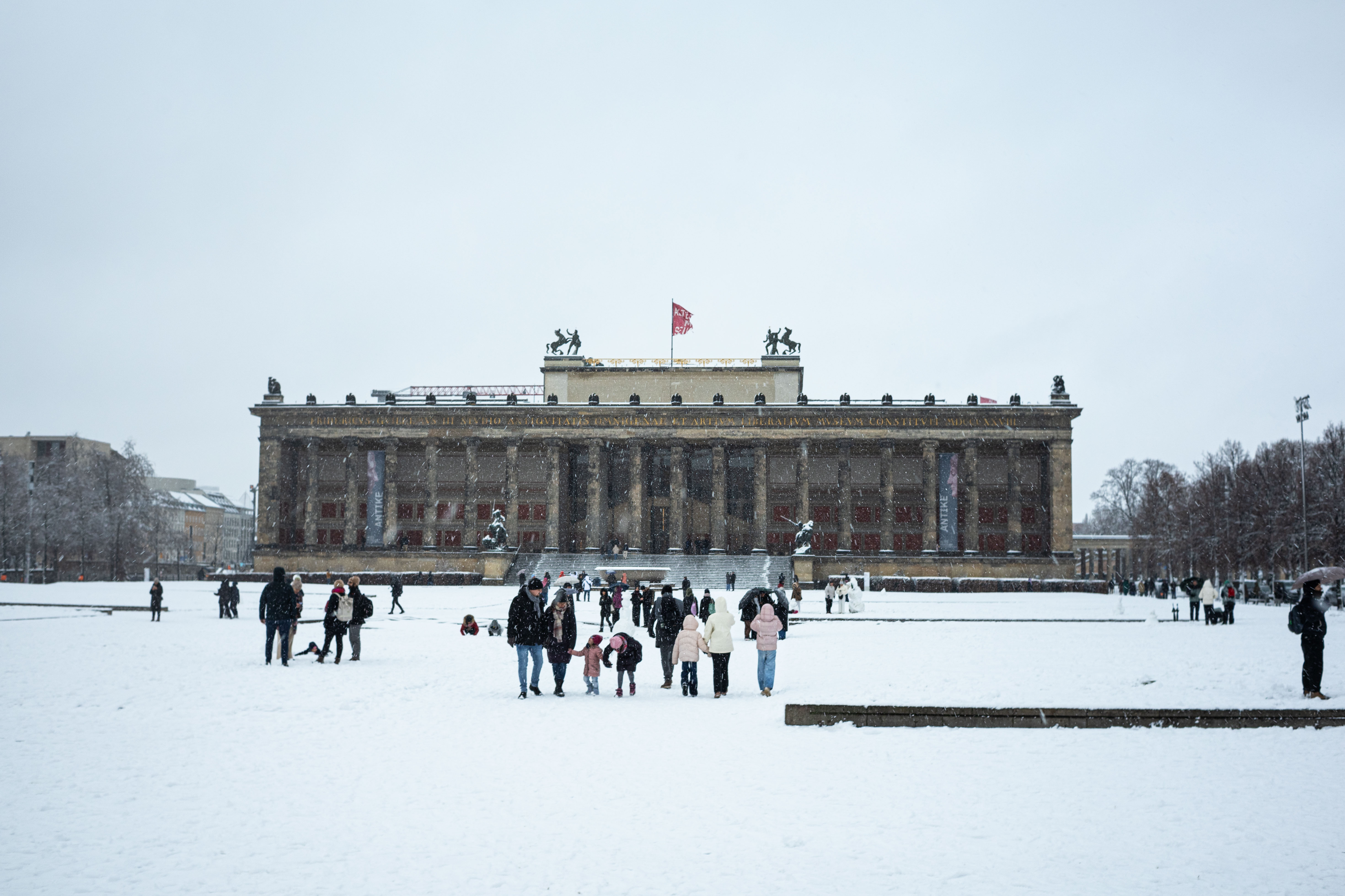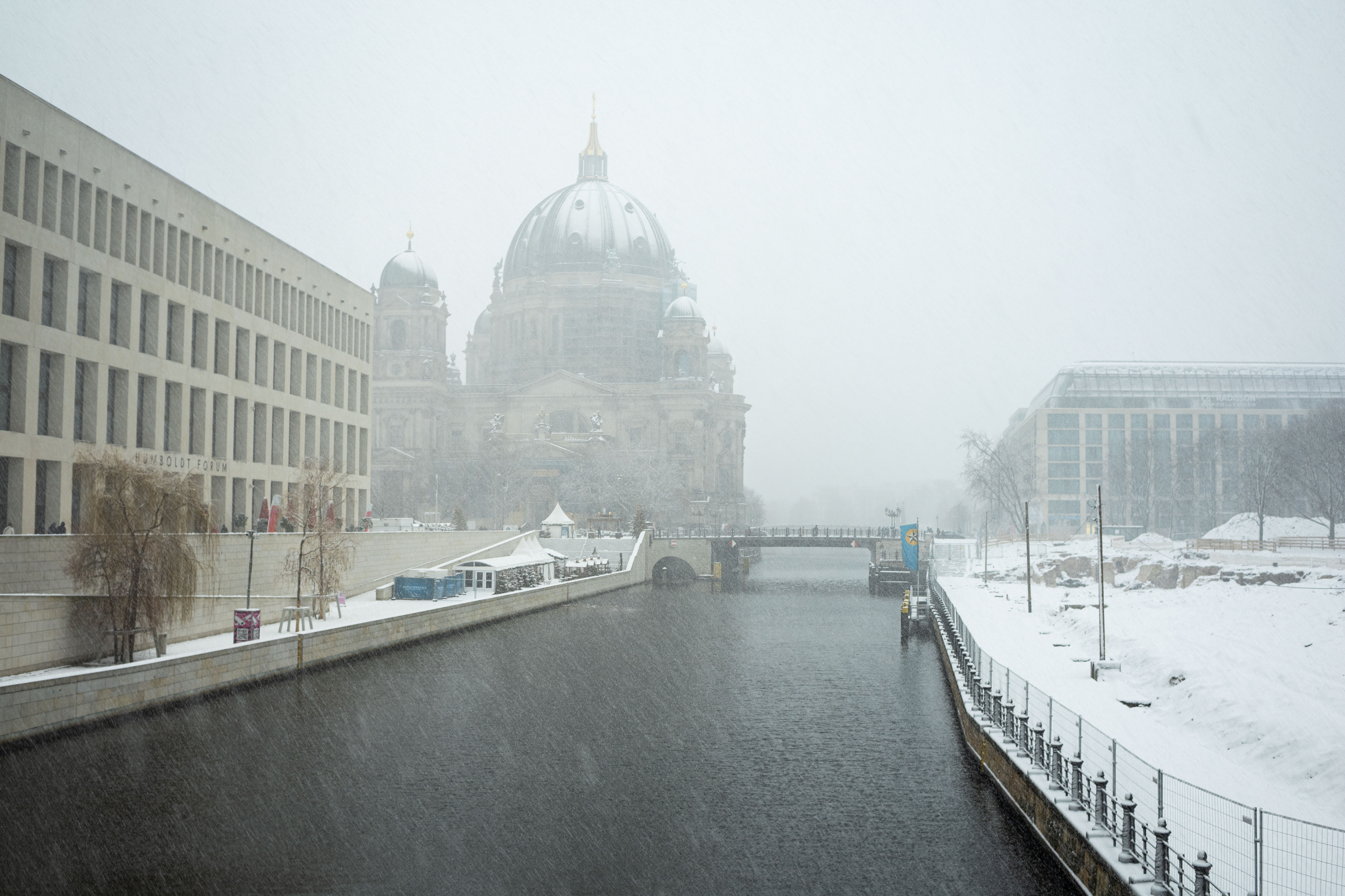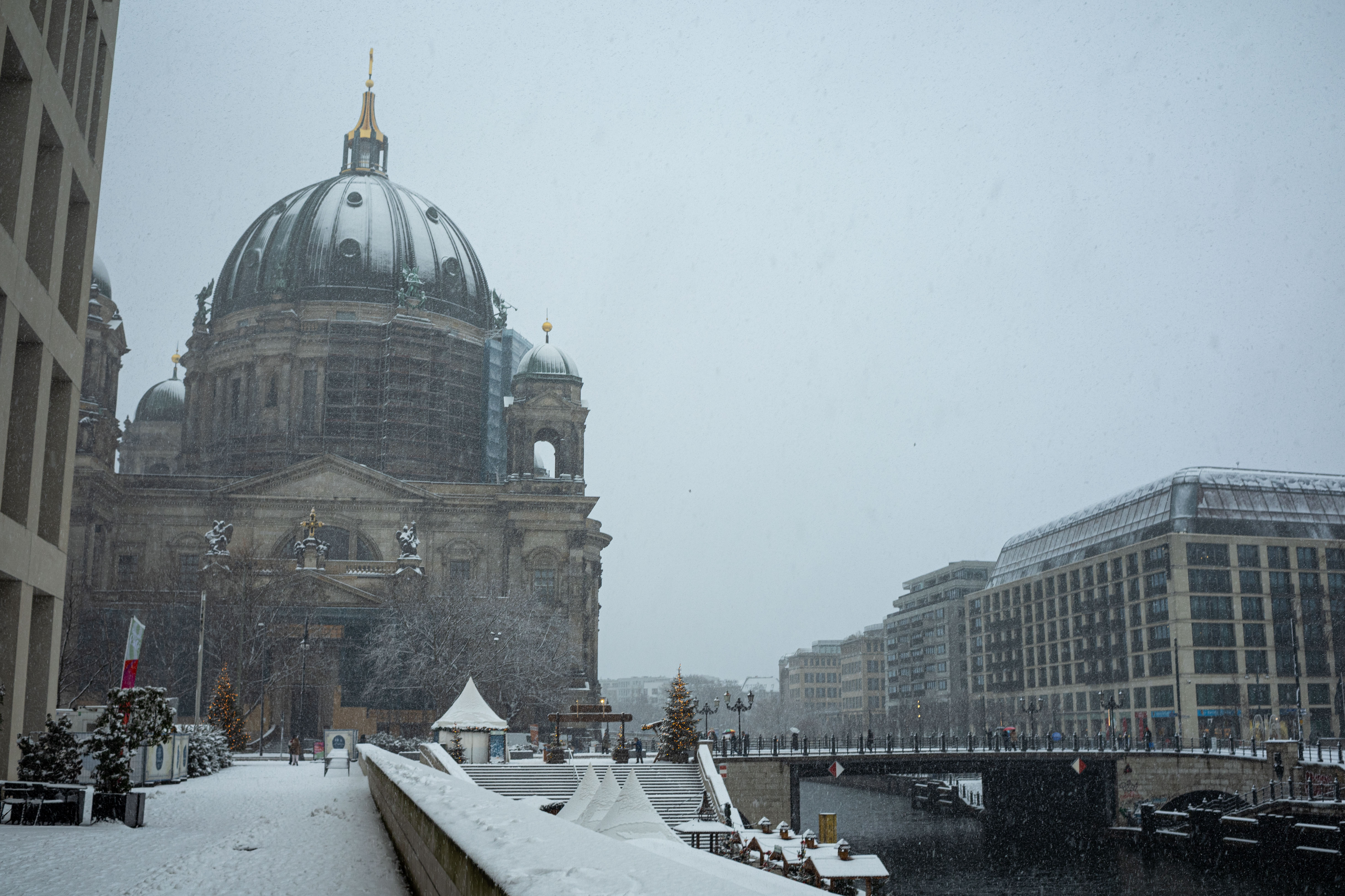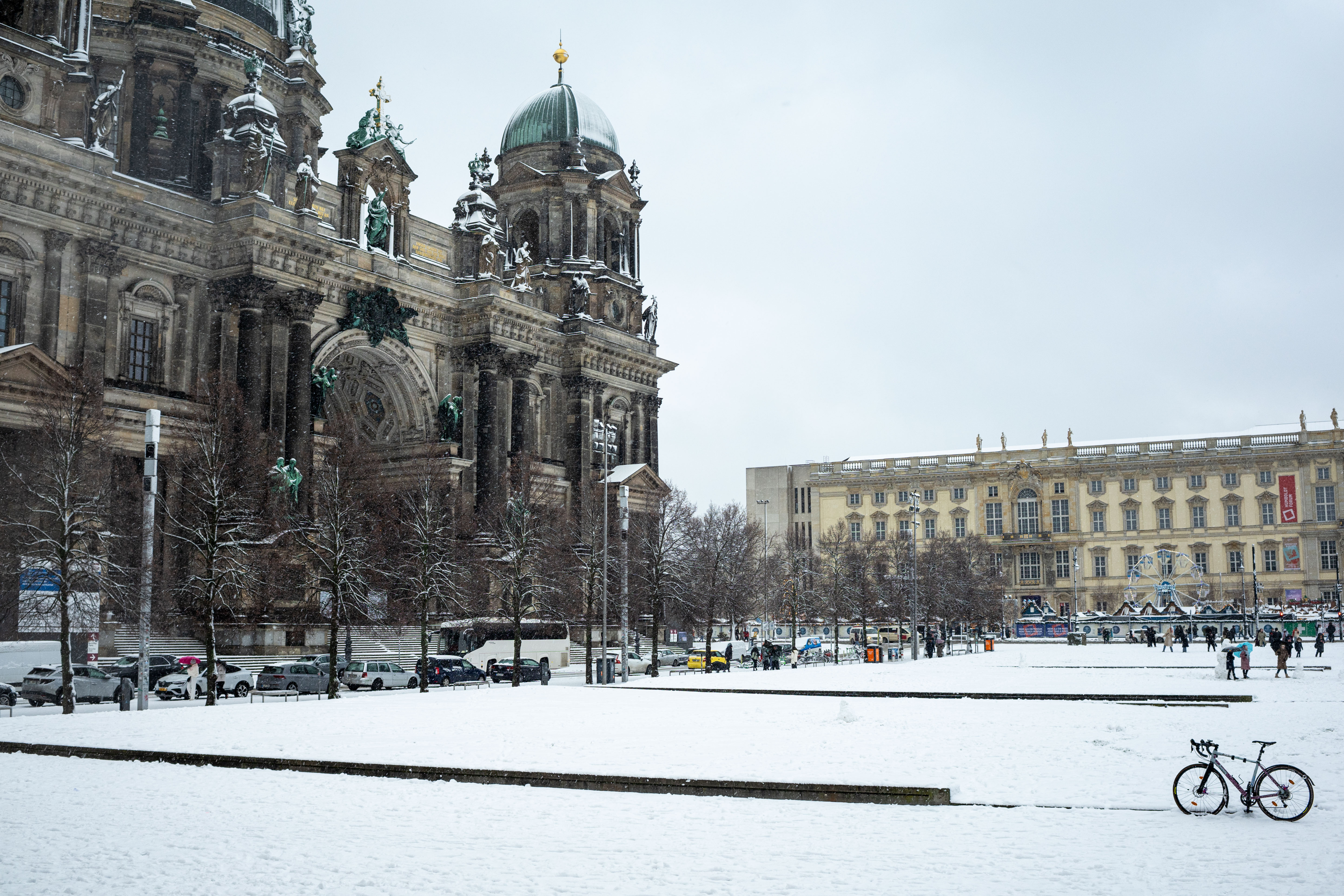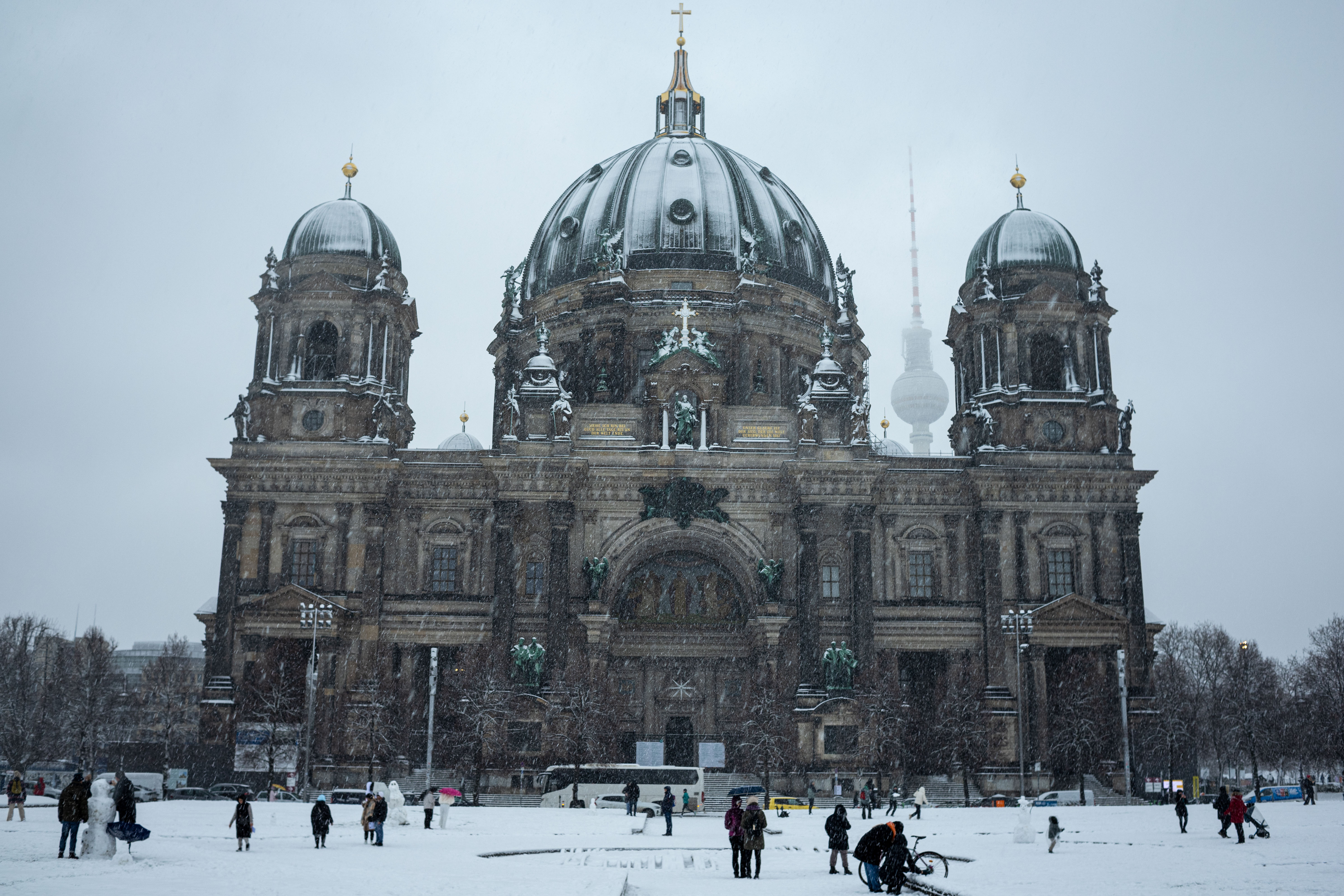 The Berliner Dom, a grand cathedral in Berlin, Germany, is captured in a snowy scene. The cathedral, constructed from stone, features two domes and a central bell tower. The photo is taken from a distance, with the cathedral's intricate details and architectural grandeur visible. The sky is gray, and the ground is covered in snow, adding to the winter atmosphere. People are scattered around the cathedral, some walking and others standing, creating a lively atmosphere. The image code 'sa_1600' may refer to the specific viewpoint or angle from which the photo was taken.