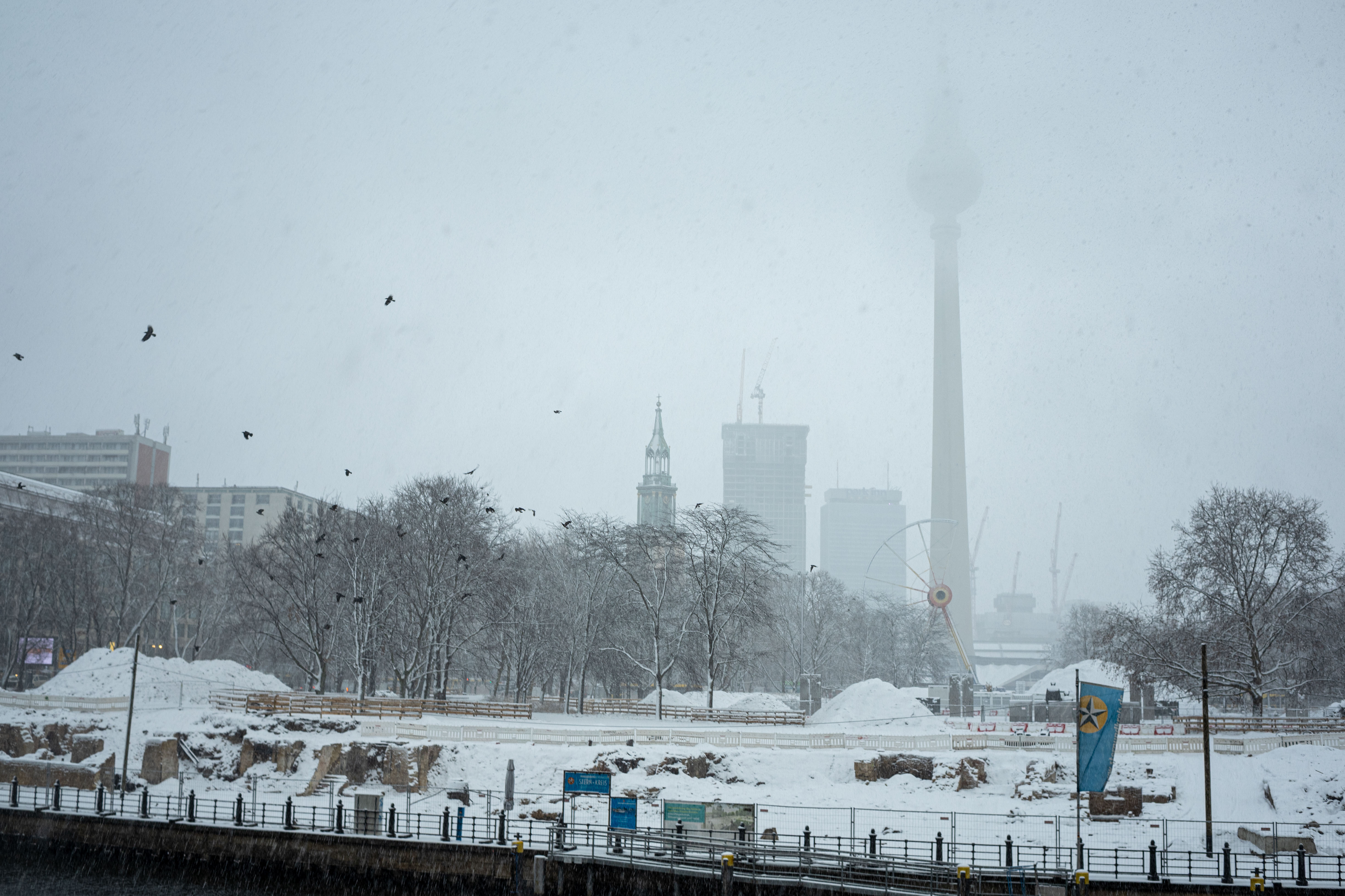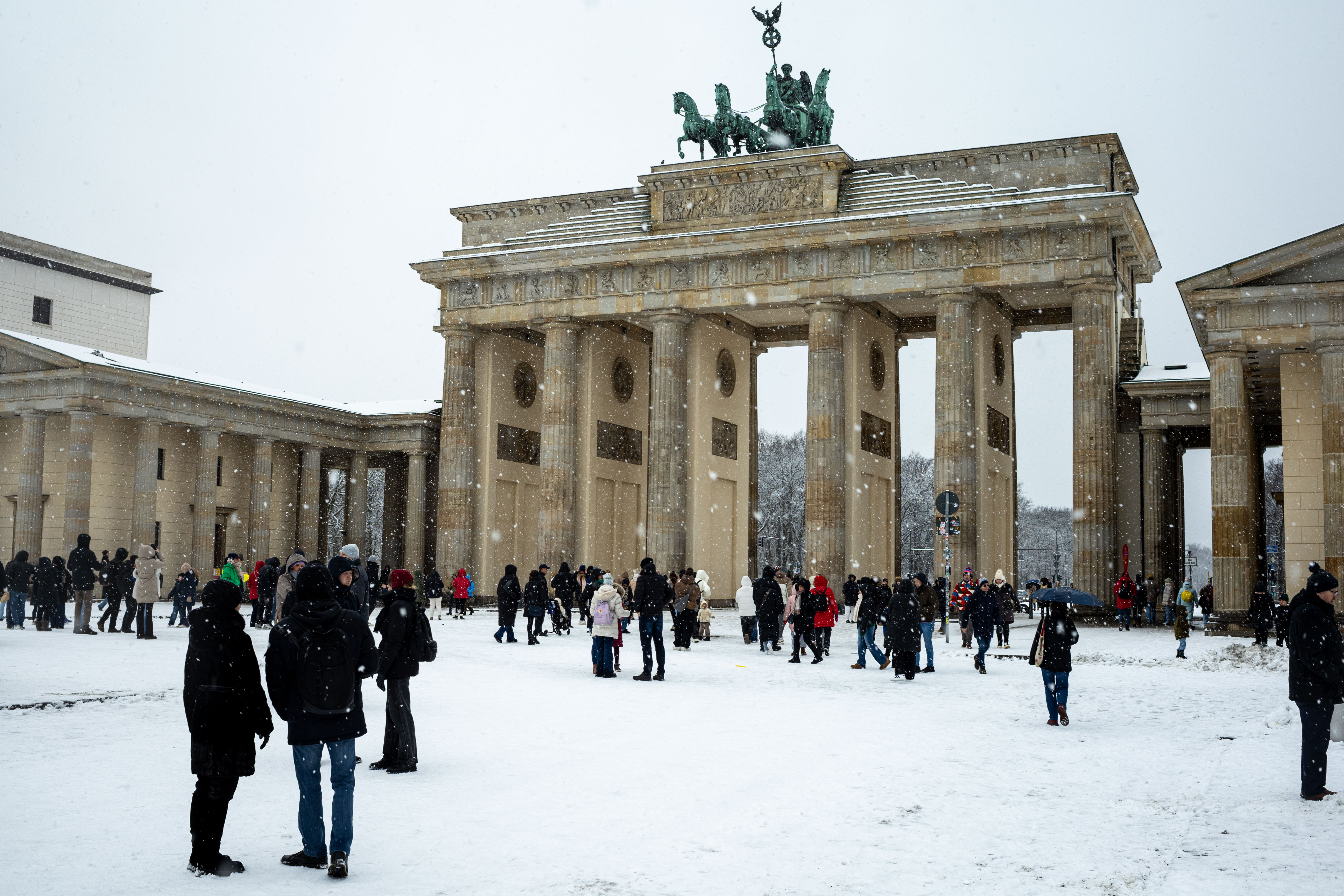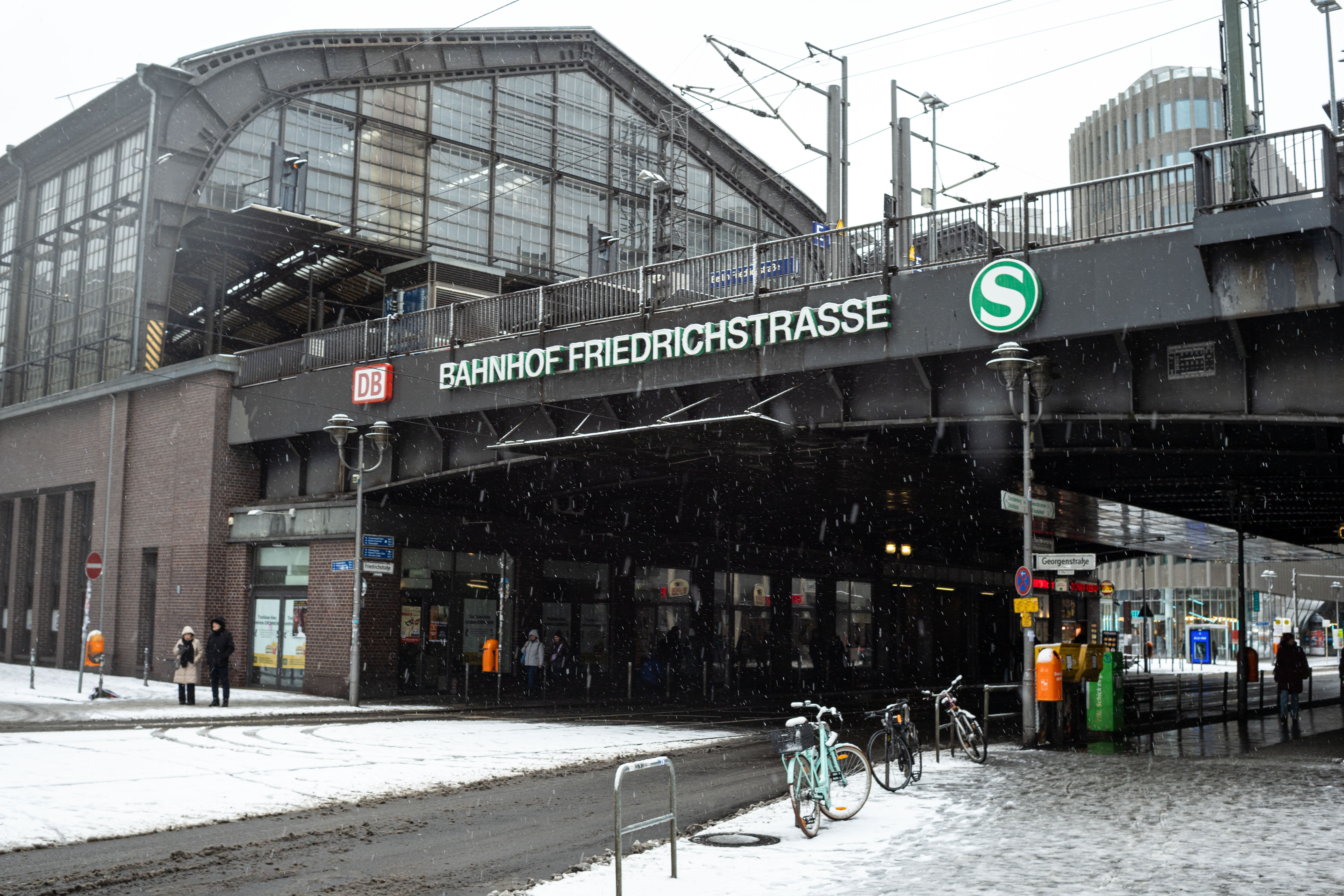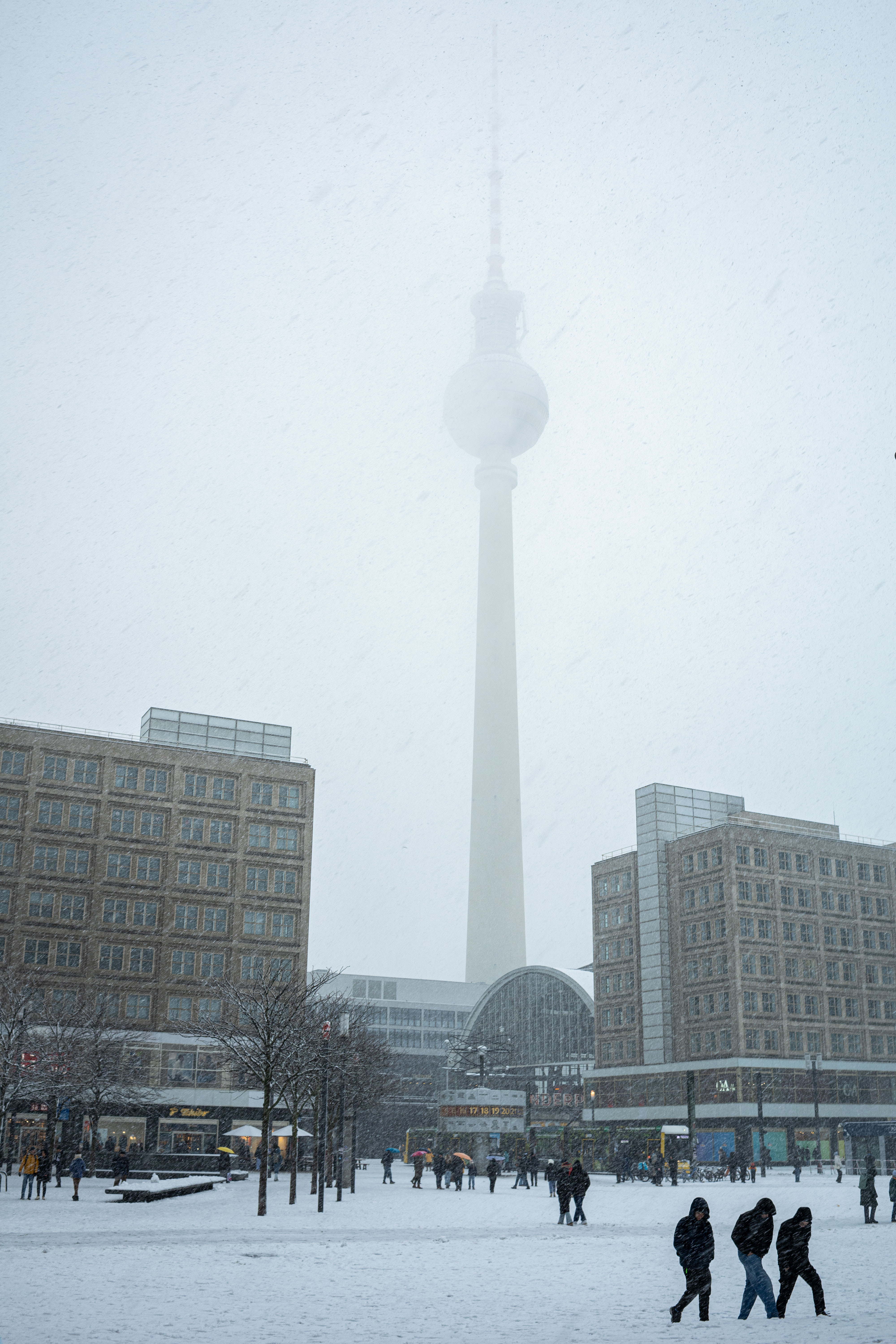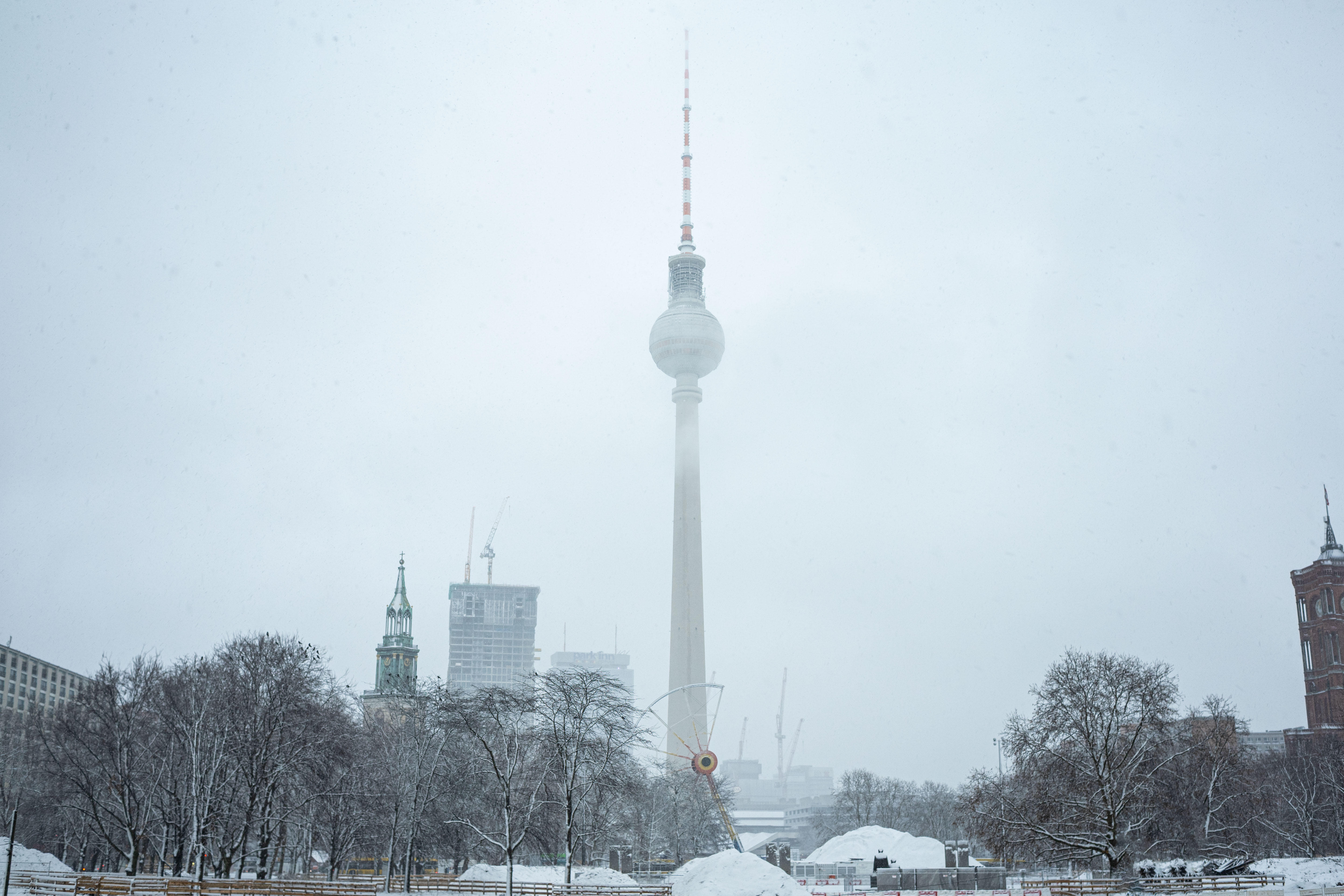 The Berliner Dom, a grand cathedral in Berlin, Germany, is captured in a snowy scene. The cathedral, constructed from stone, features two domes and a central bell tower. The photo is taken from a distance, with the cathedral's intricate details and architectural grandeur visible. The sky is gray, and the ground is covered in snow, adding to the winter atmosphere. People are scattered around the cathedral, some walking and others standing, creating a lively atmosphere. The image code 'sa_1600' may refer to the specific viewpoint or angle from which the photo was taken.