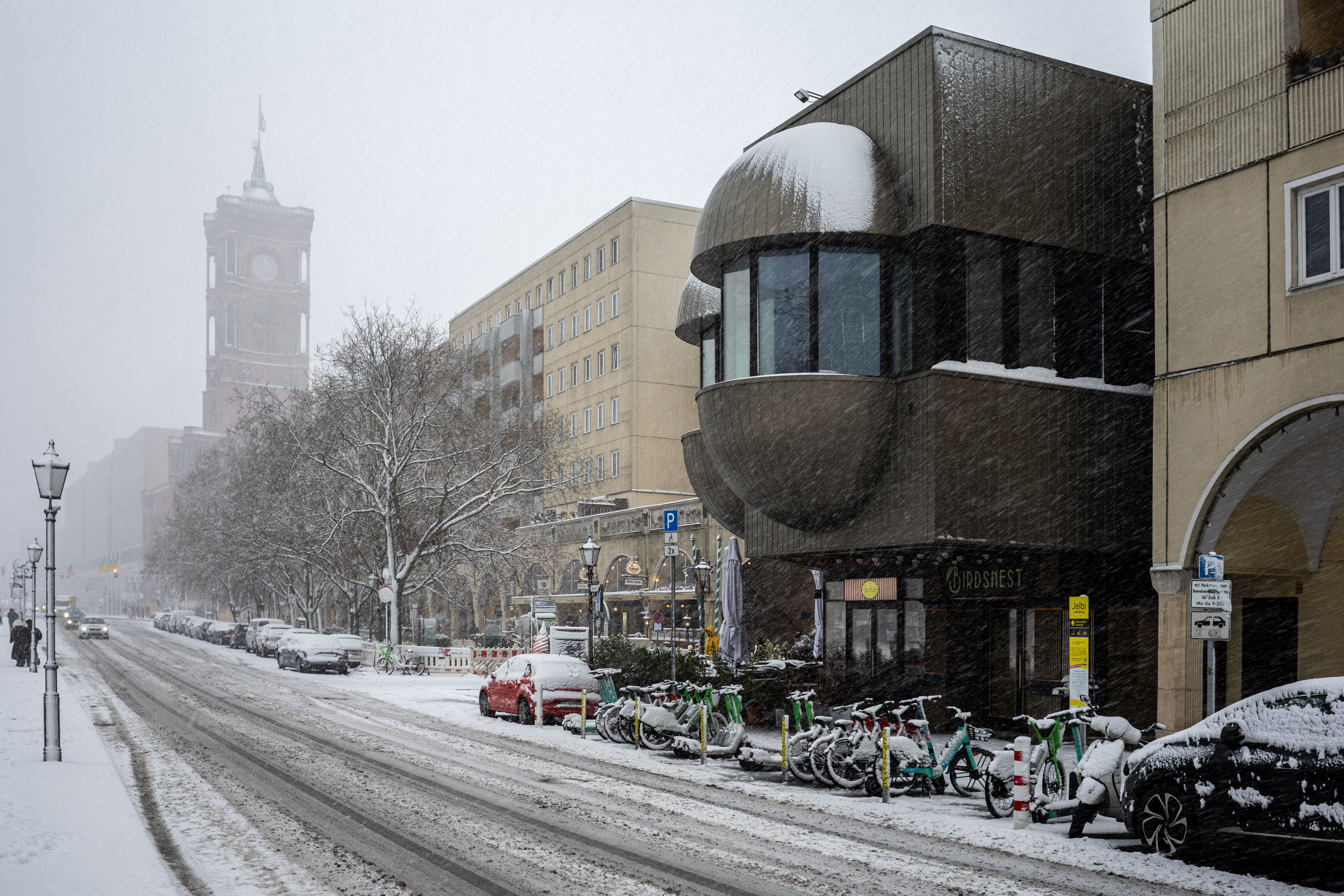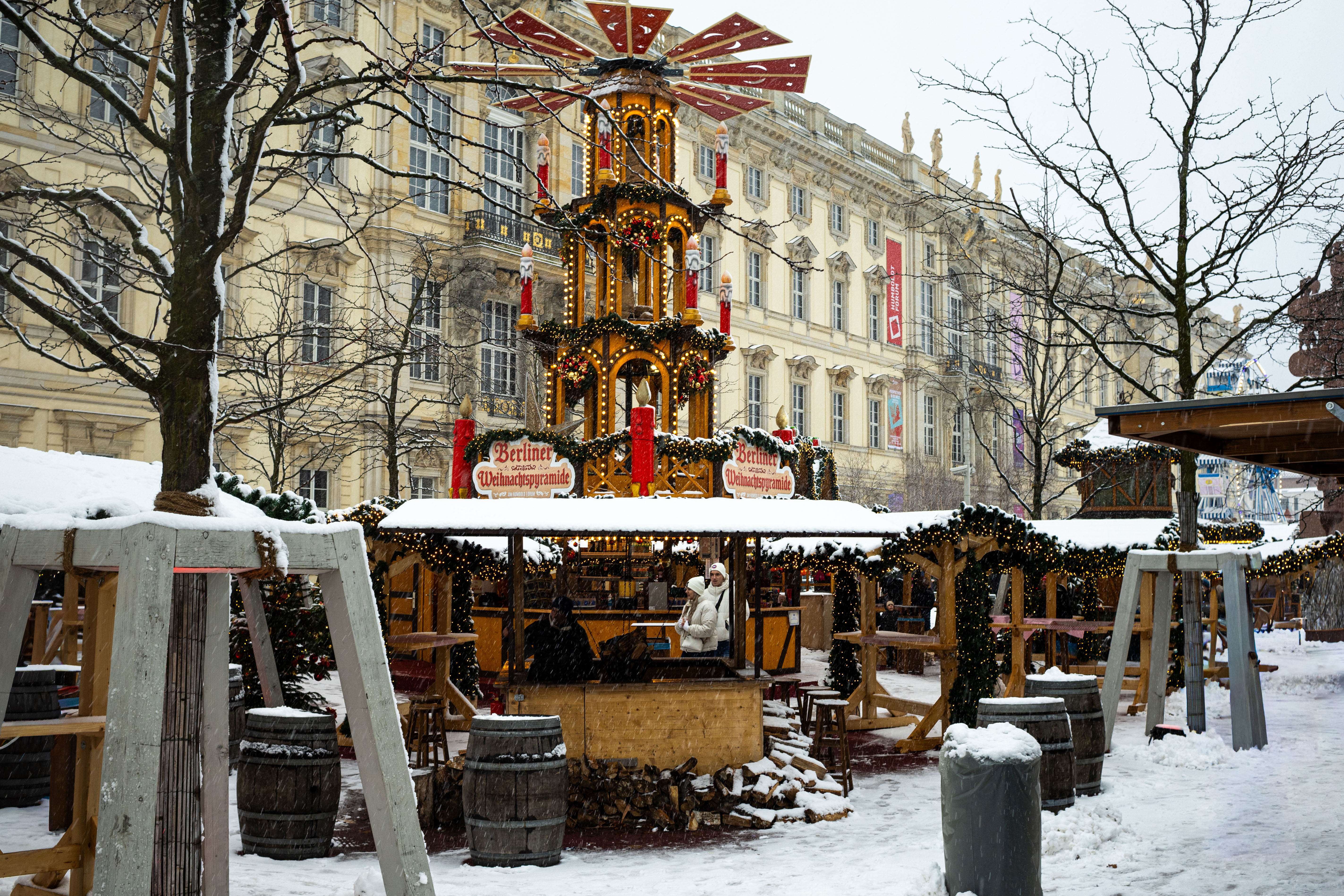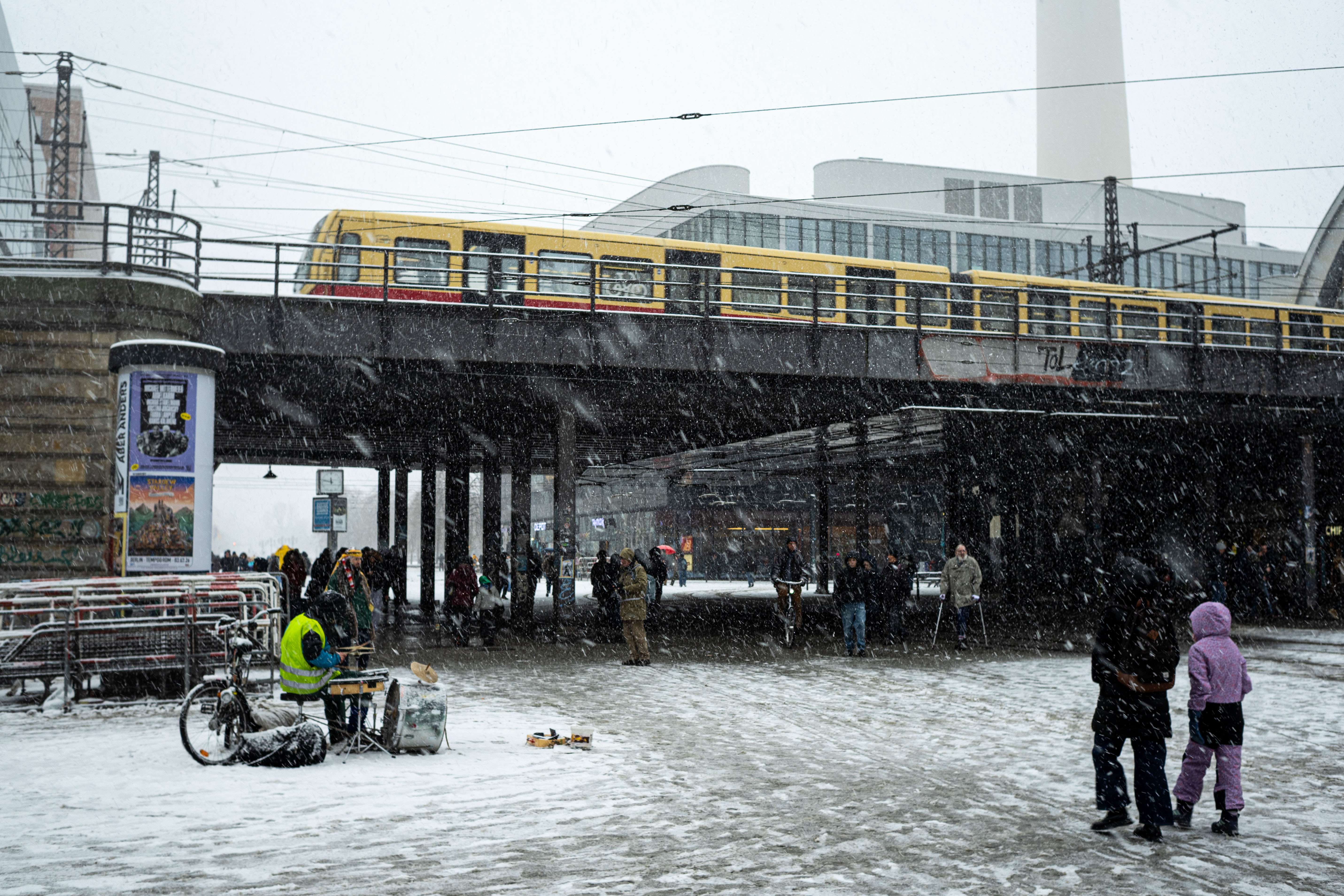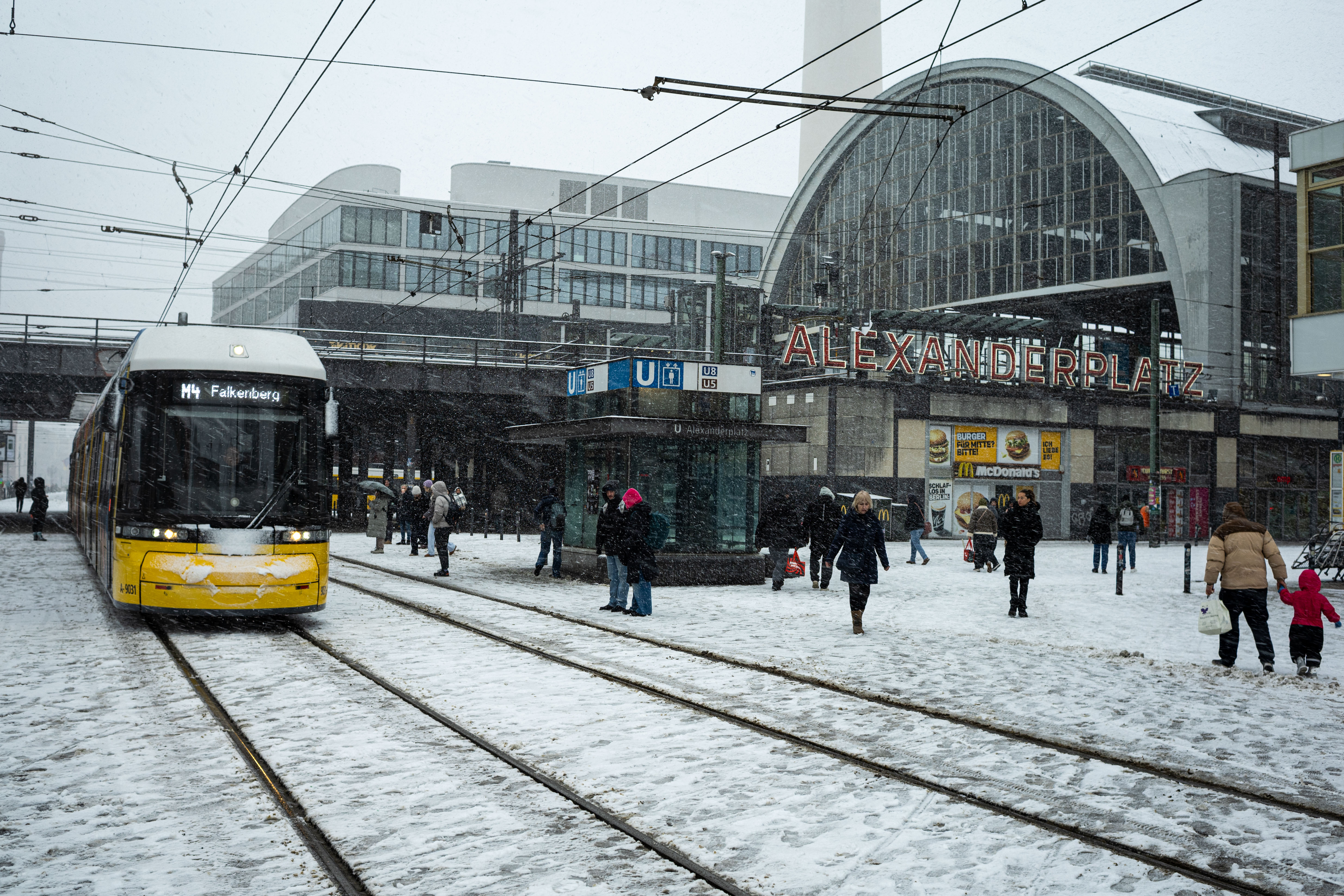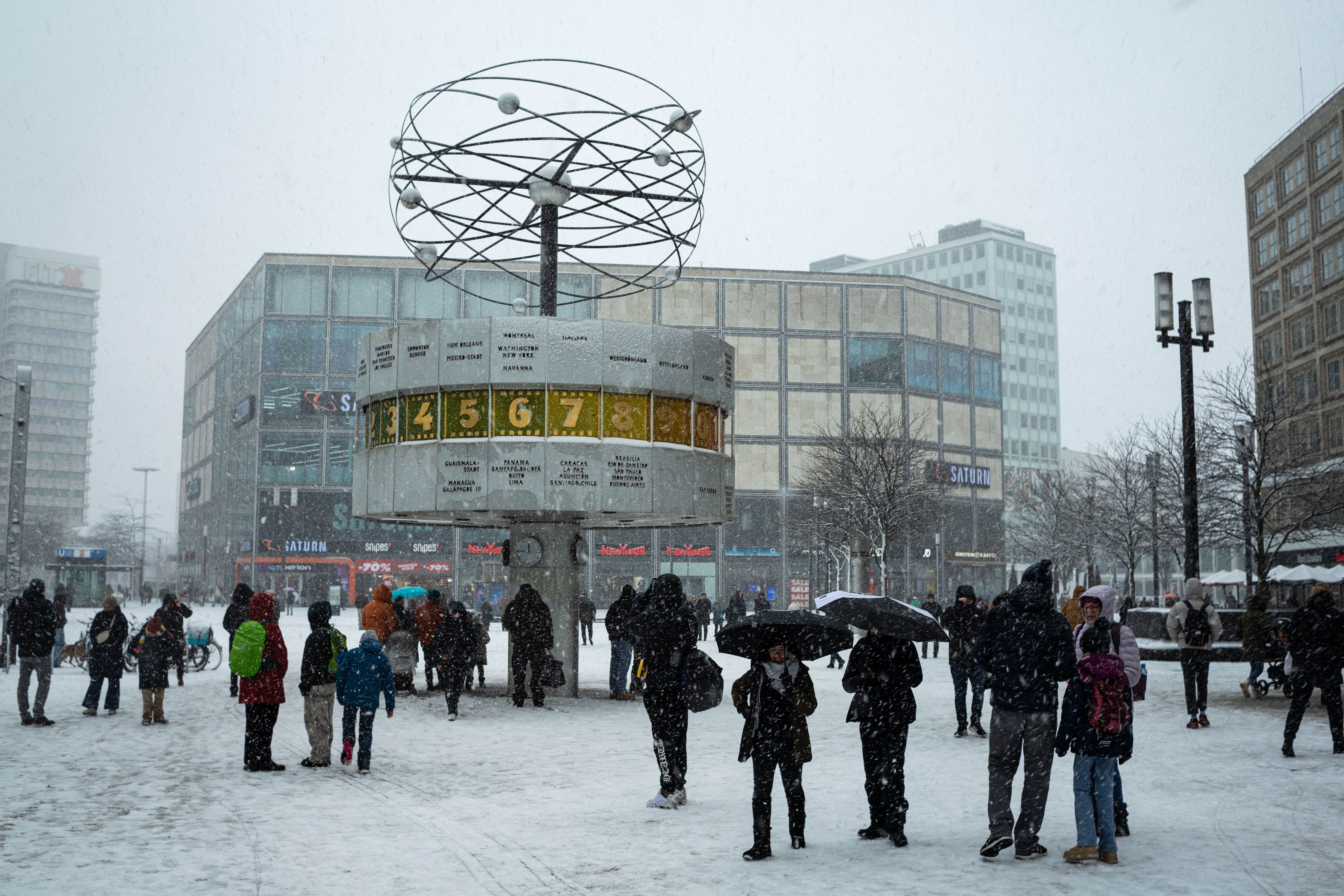 The Berliner Dom, a grand cathedral in Berlin, Germany, is captured in a snowy scene. The cathedral, constructed from stone, features two domes and a central bell tower. The photo is taken from a distance, with the cathedral's intricate details and architectural grandeur visible. The sky is gray, and the ground is covered in snow, adding to the winter atmosphere. People are scattered around the cathedral, some walking and others standing, creating a lively atmosphere. The image code 'sa_1600' may refer to the specific viewpoint or angle from which the photo was taken.