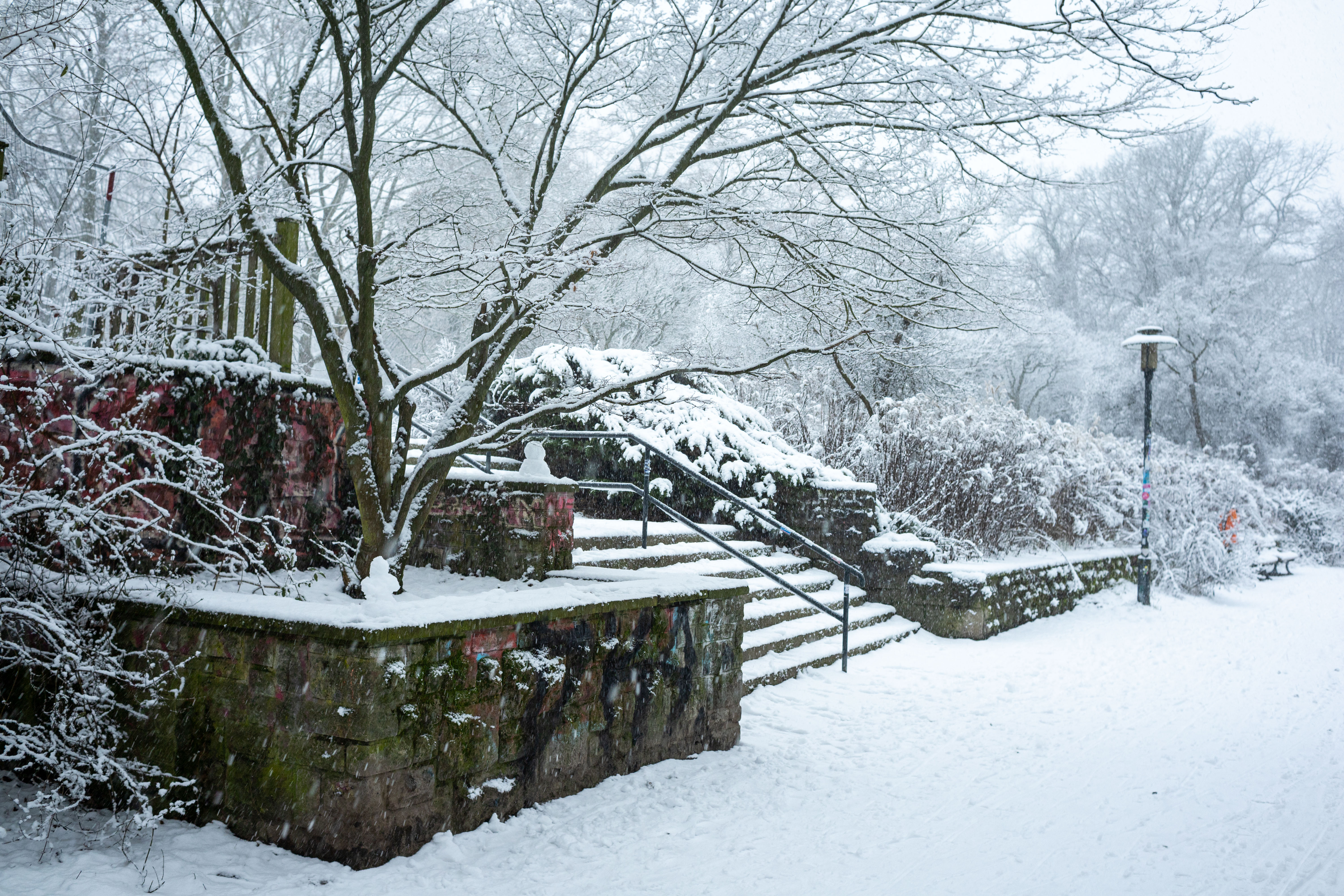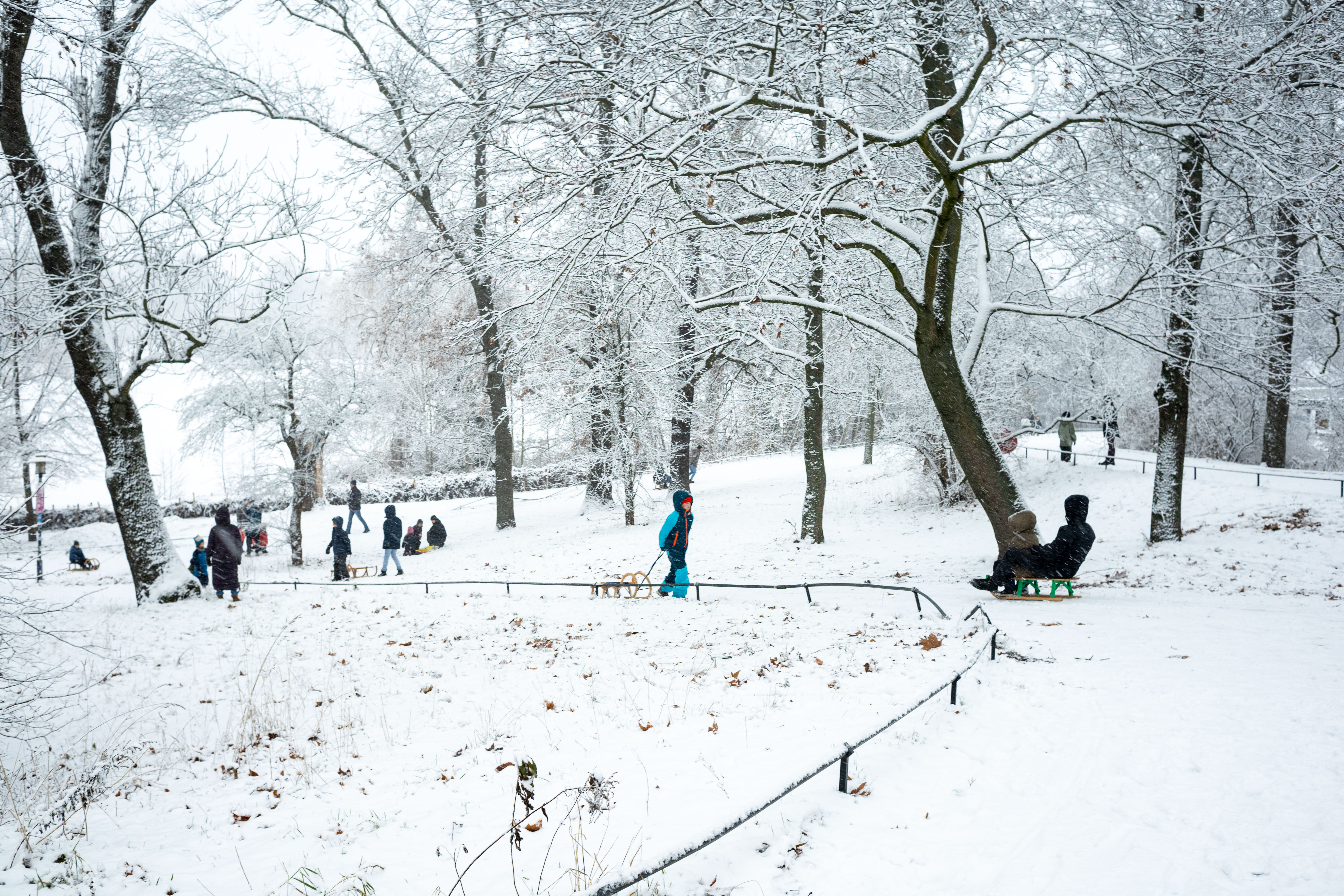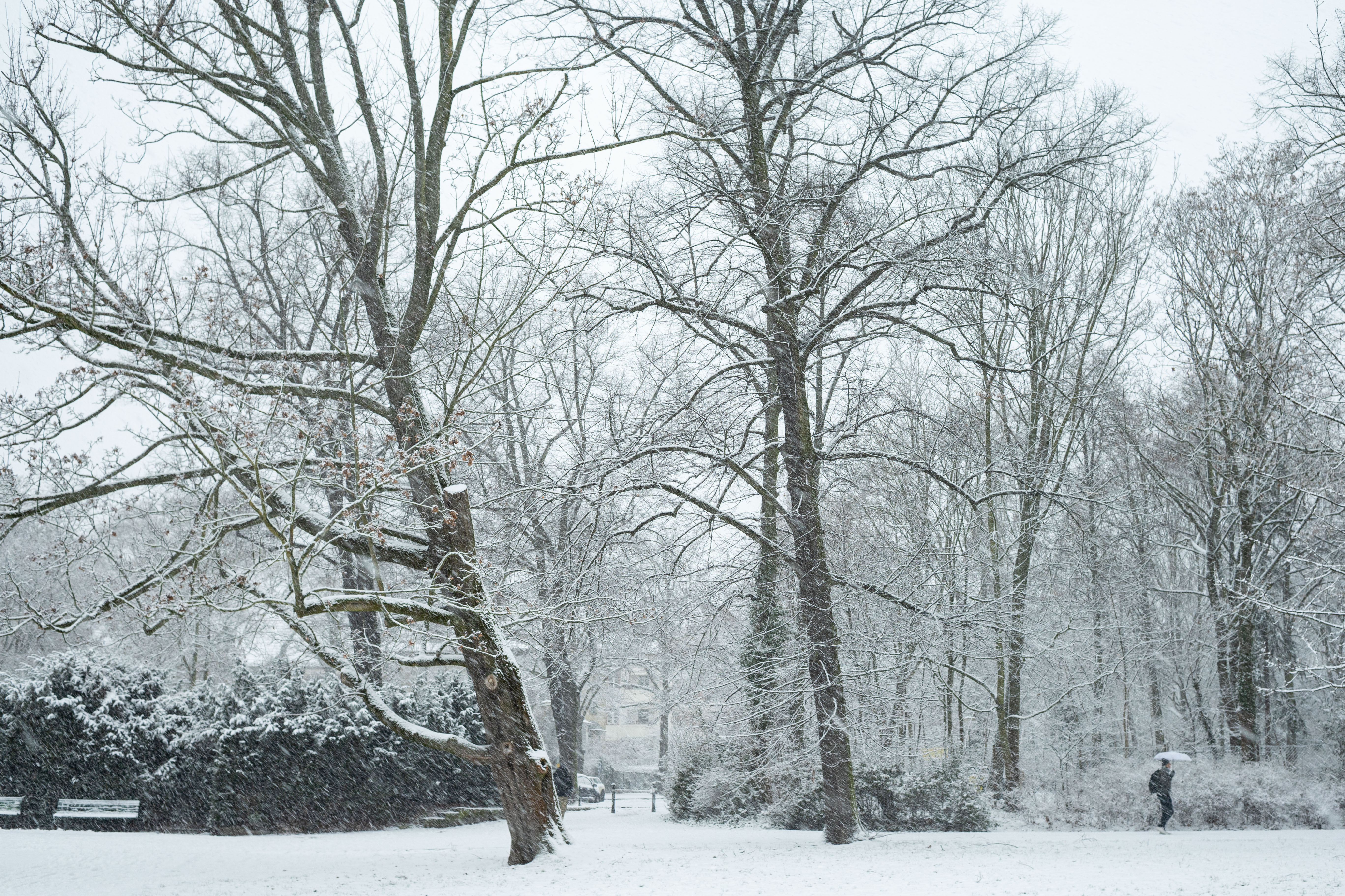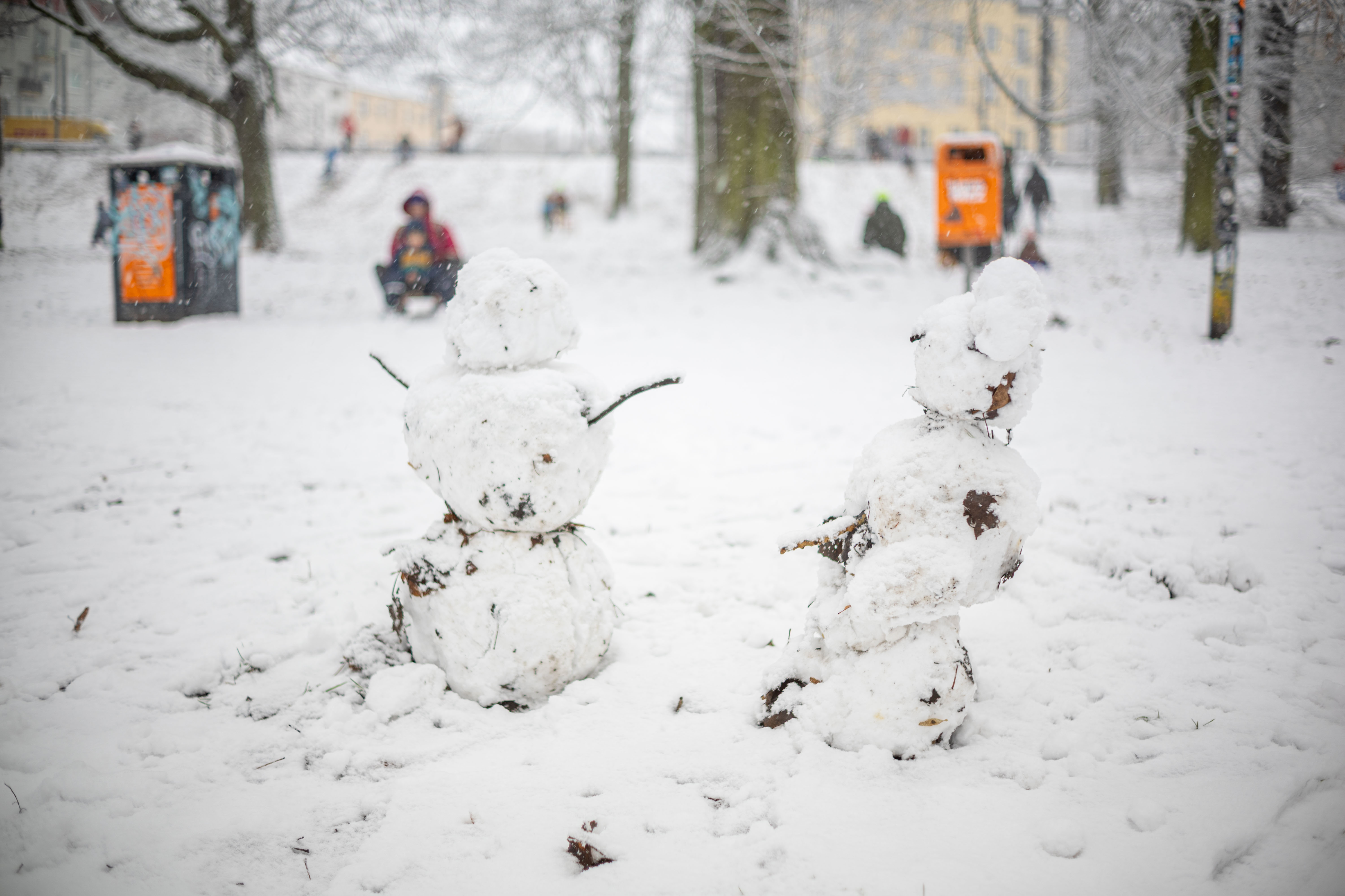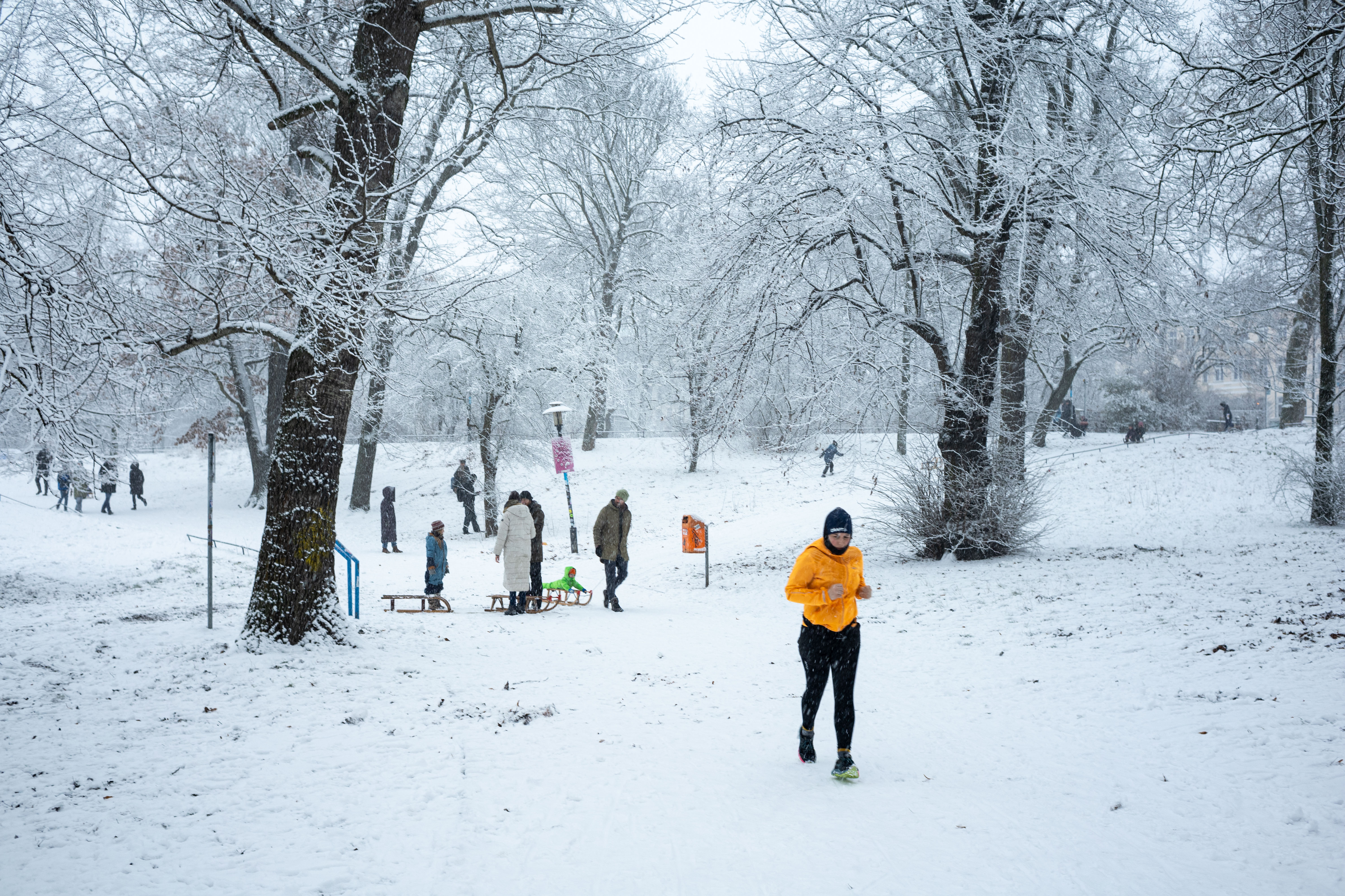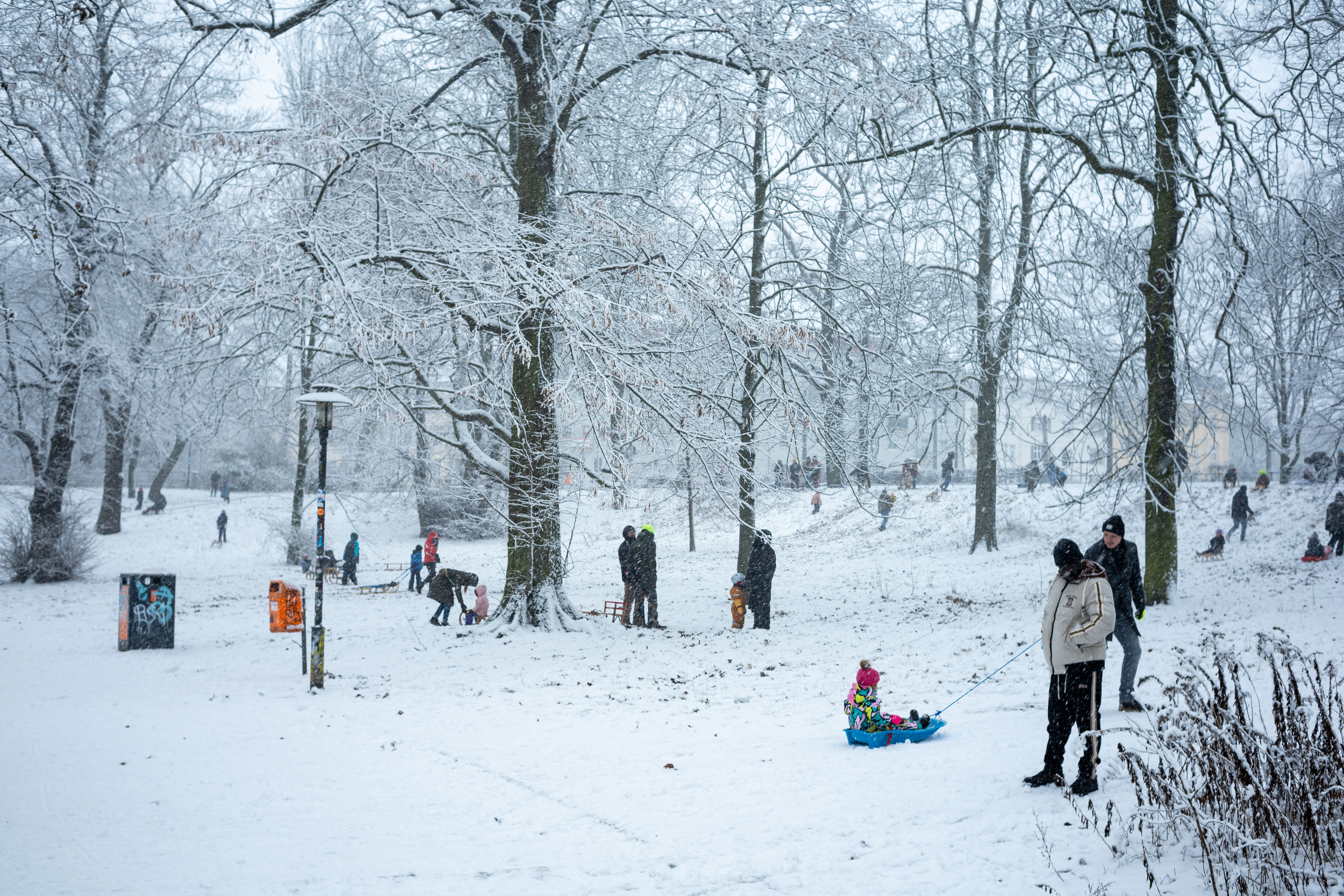 The Berliner Dom, a grand cathedral in Berlin, Germany, is captured in a snowy scene. The cathedral, constructed from stone, features two domes and a central bell tower. The photo is taken from a distance, with the cathedral's intricate details and architectural grandeur visible. The sky is gray, and the ground is covered in snow, adding to the winter atmosphere. People are scattered around the cathedral, some walking and others standing, creating a lively atmosphere. The image code 'sa_1600' may refer to the specific viewpoint or angle from which the photo was taken.