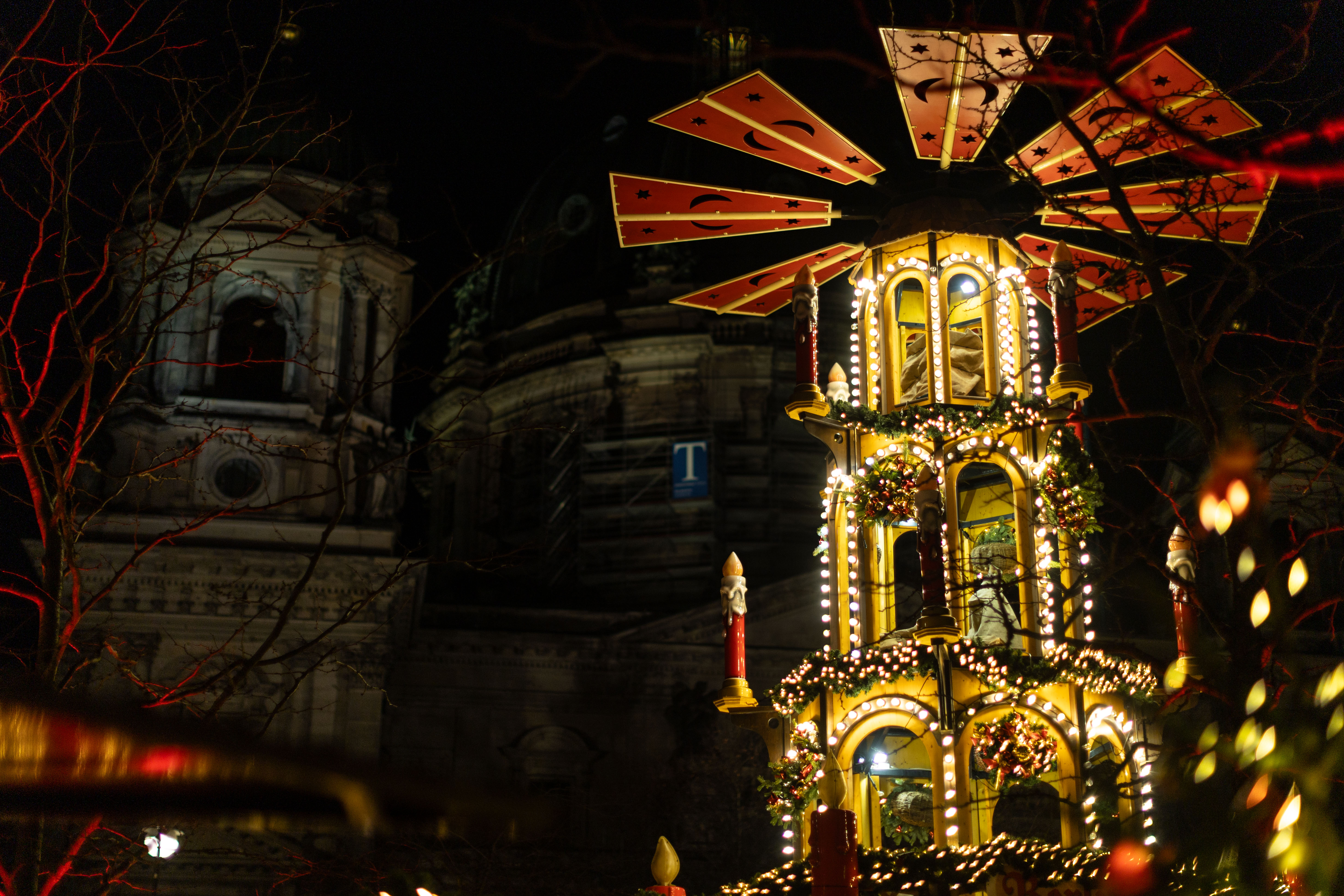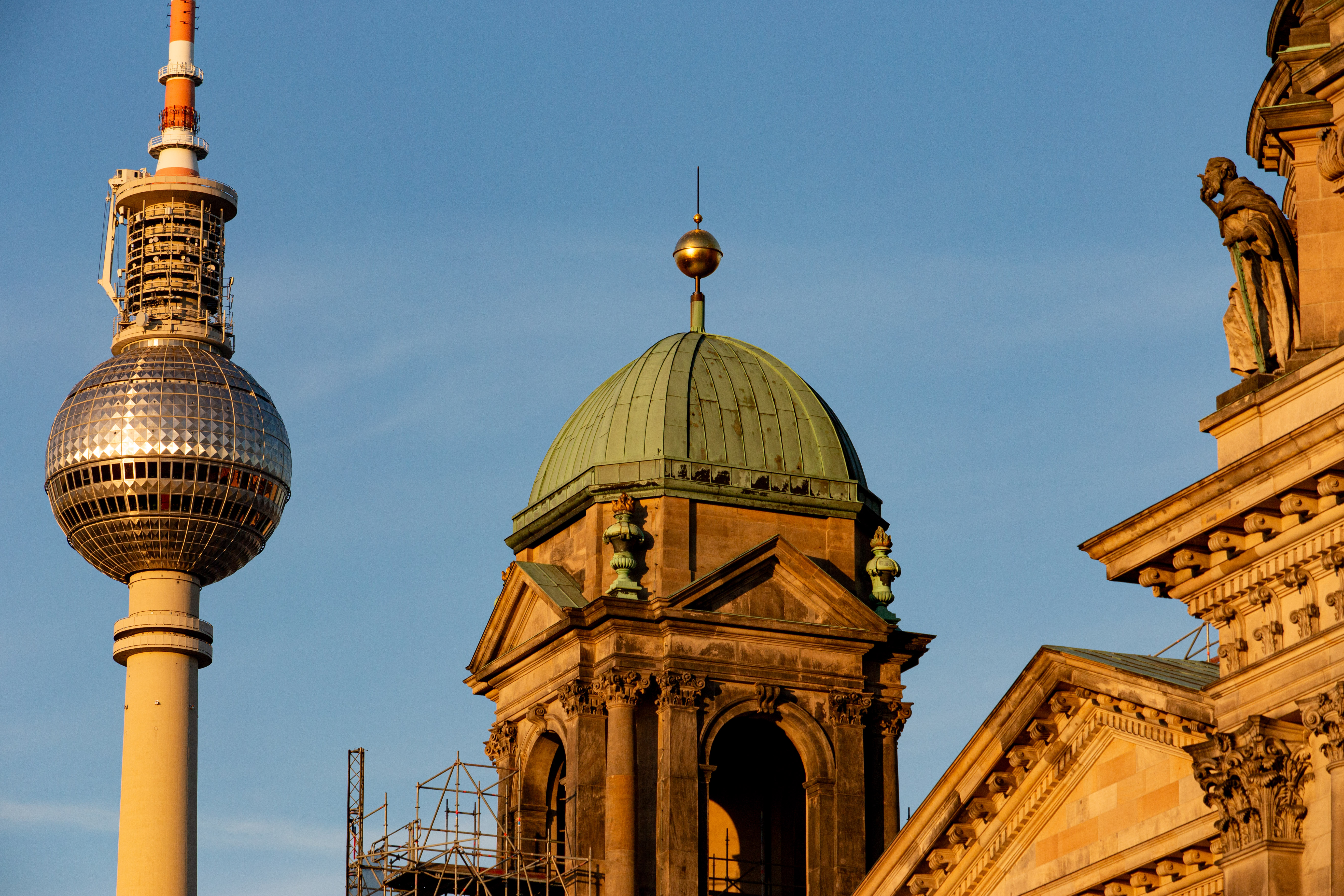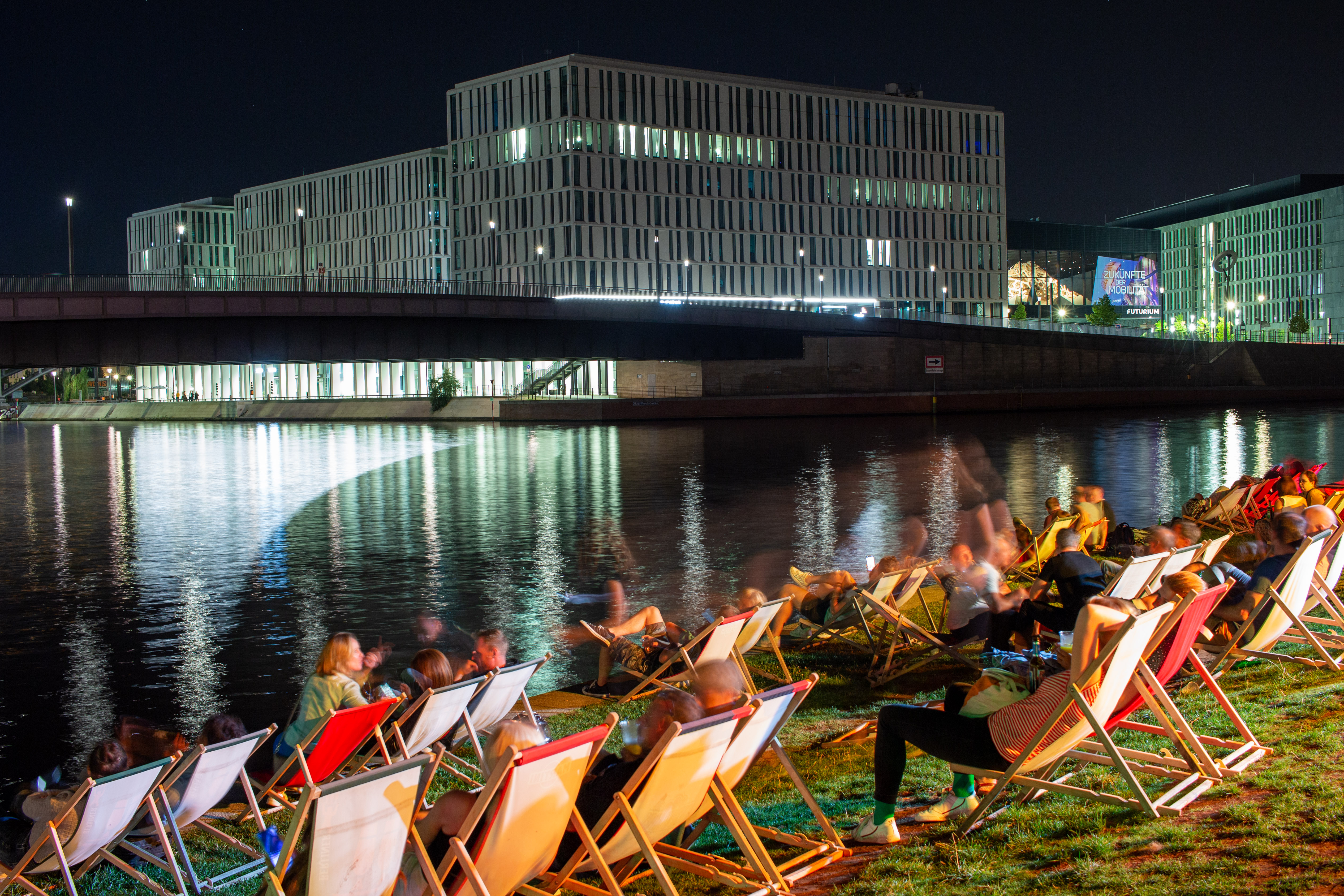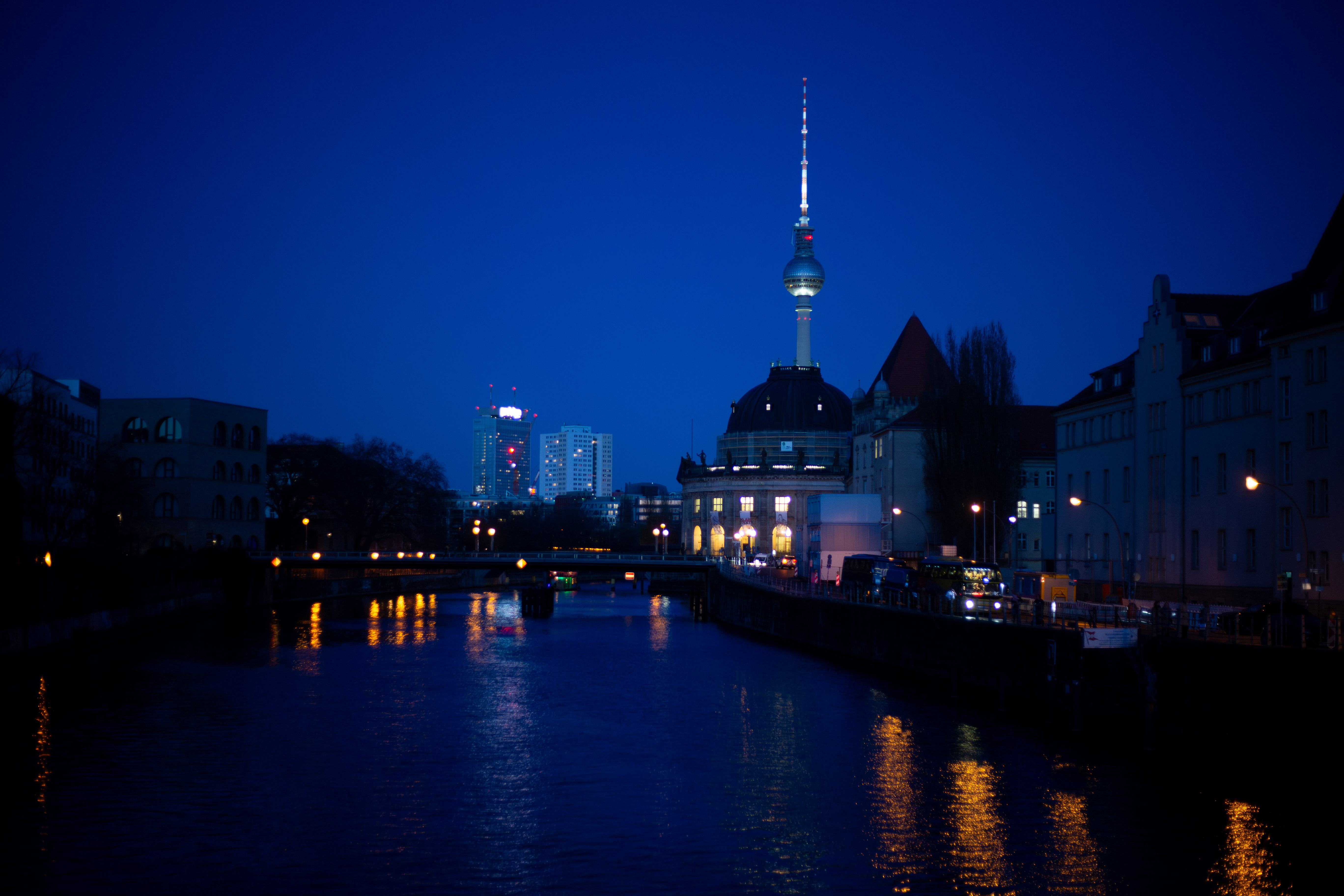 The image captures a serene night scene in Berlin, Germany, with the Berliner Sky Tower prominently displayed against a dark blue sky. The tower, illuminated in blue, stands tall on the left side of the frame, with its spire reaching towards the sky. The Berliner River, reflecting the city's lights, flows on the right side of the image. The buildings, mostly dark in color, are illuminated by streetlights, creating a warm glow. The perspective is from a high vantage point, looking down on the river and the tower, emphasizing the tower's height and prominence. The image is a beautiful representation of Berlin's skyline at night.