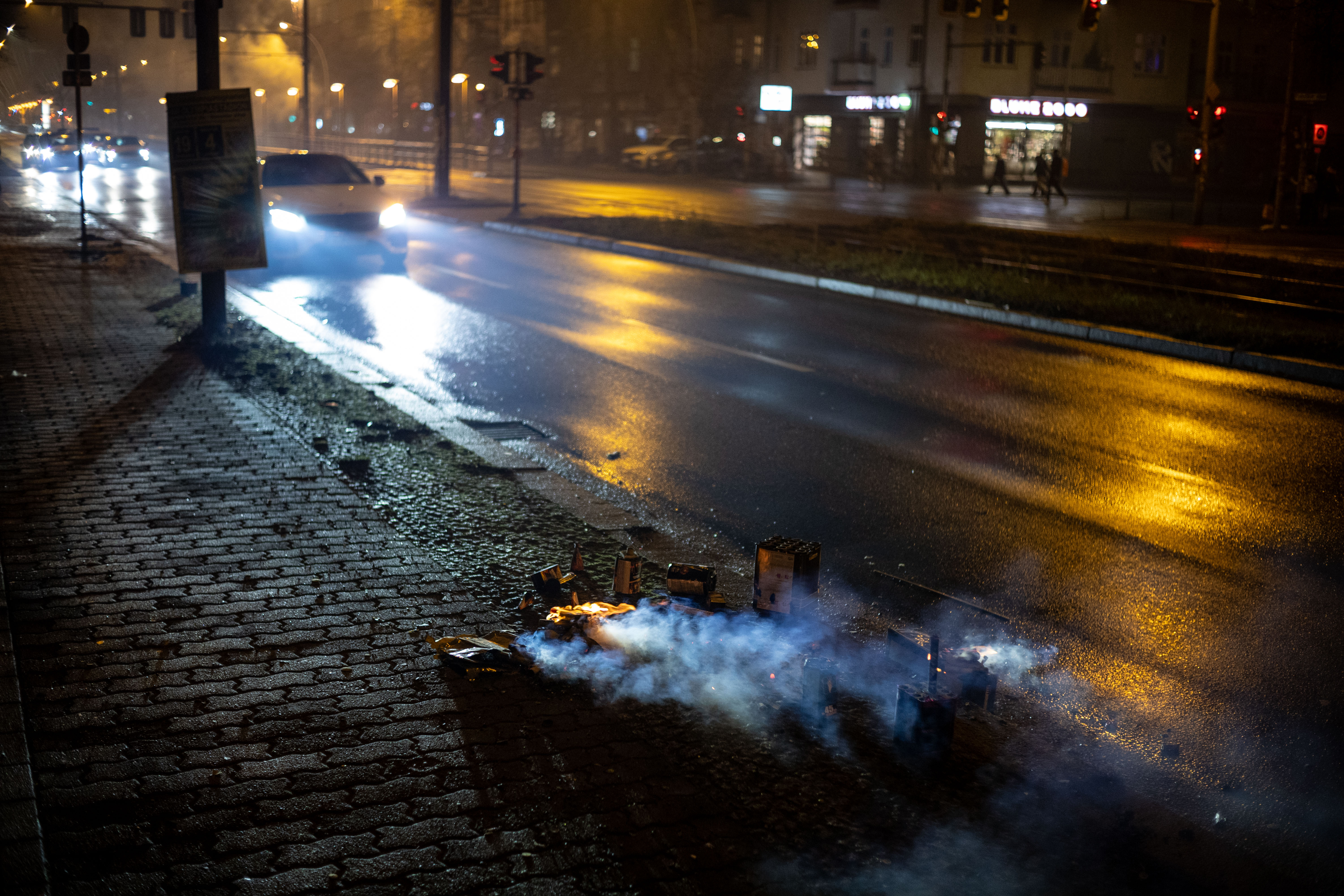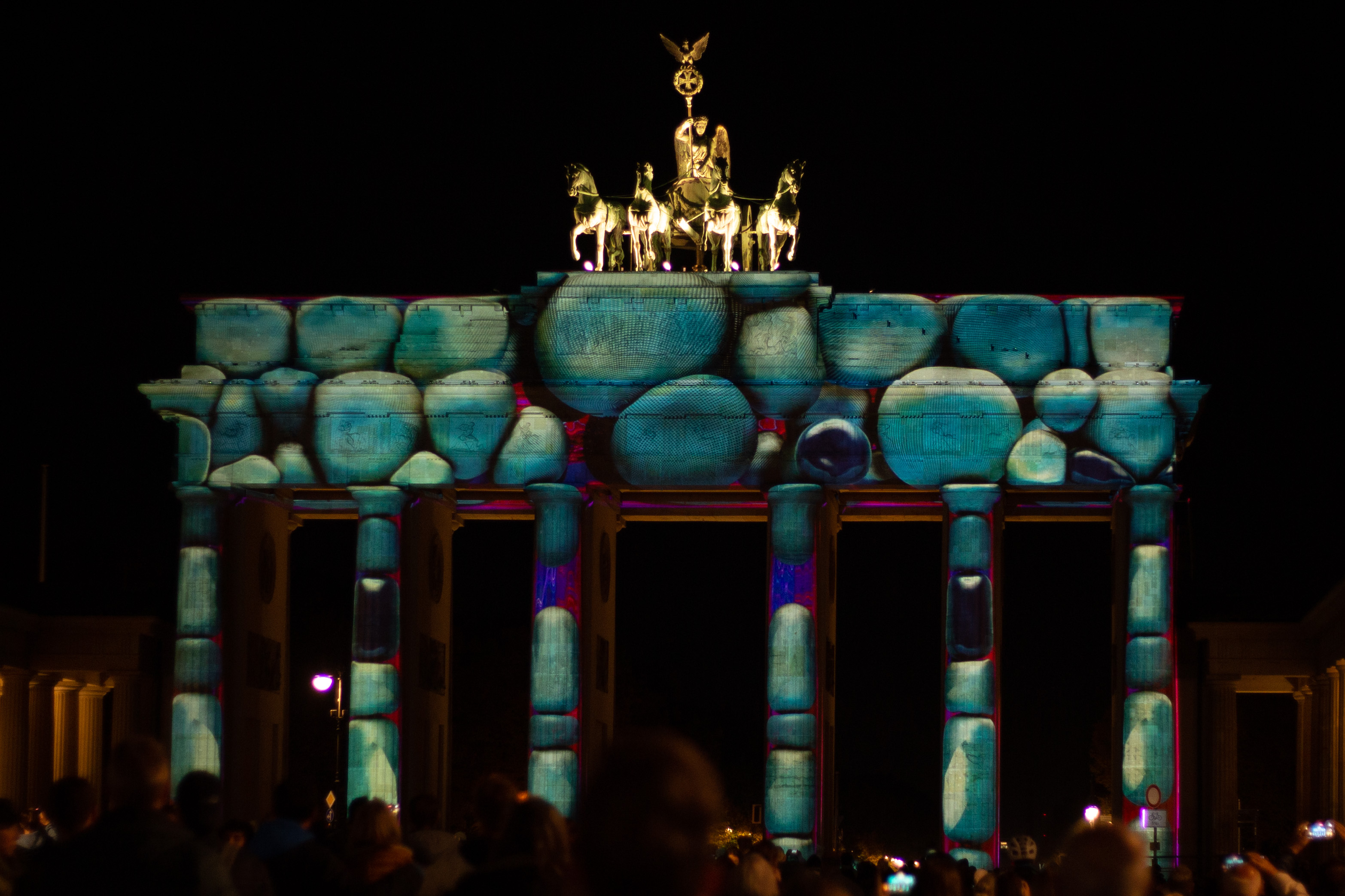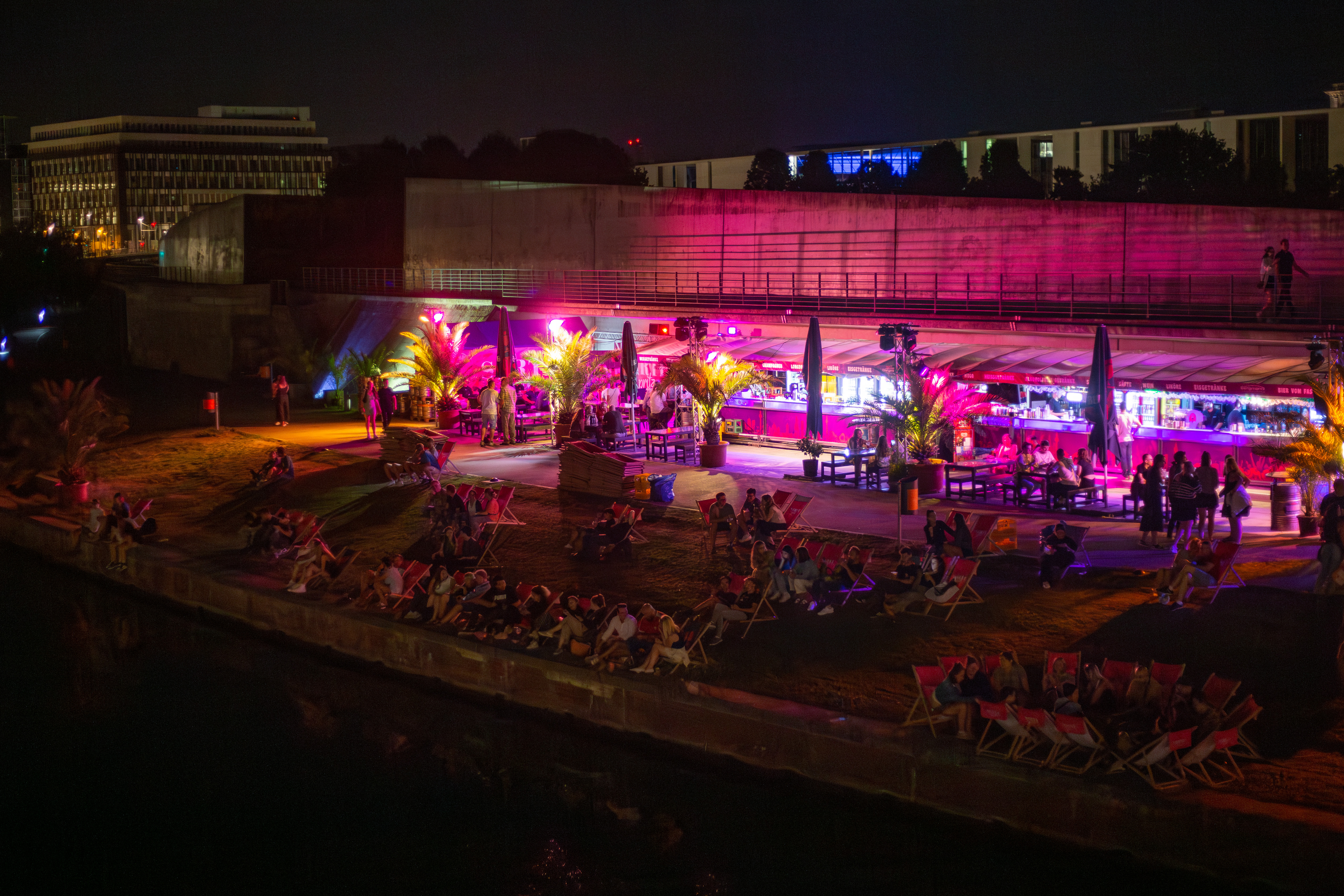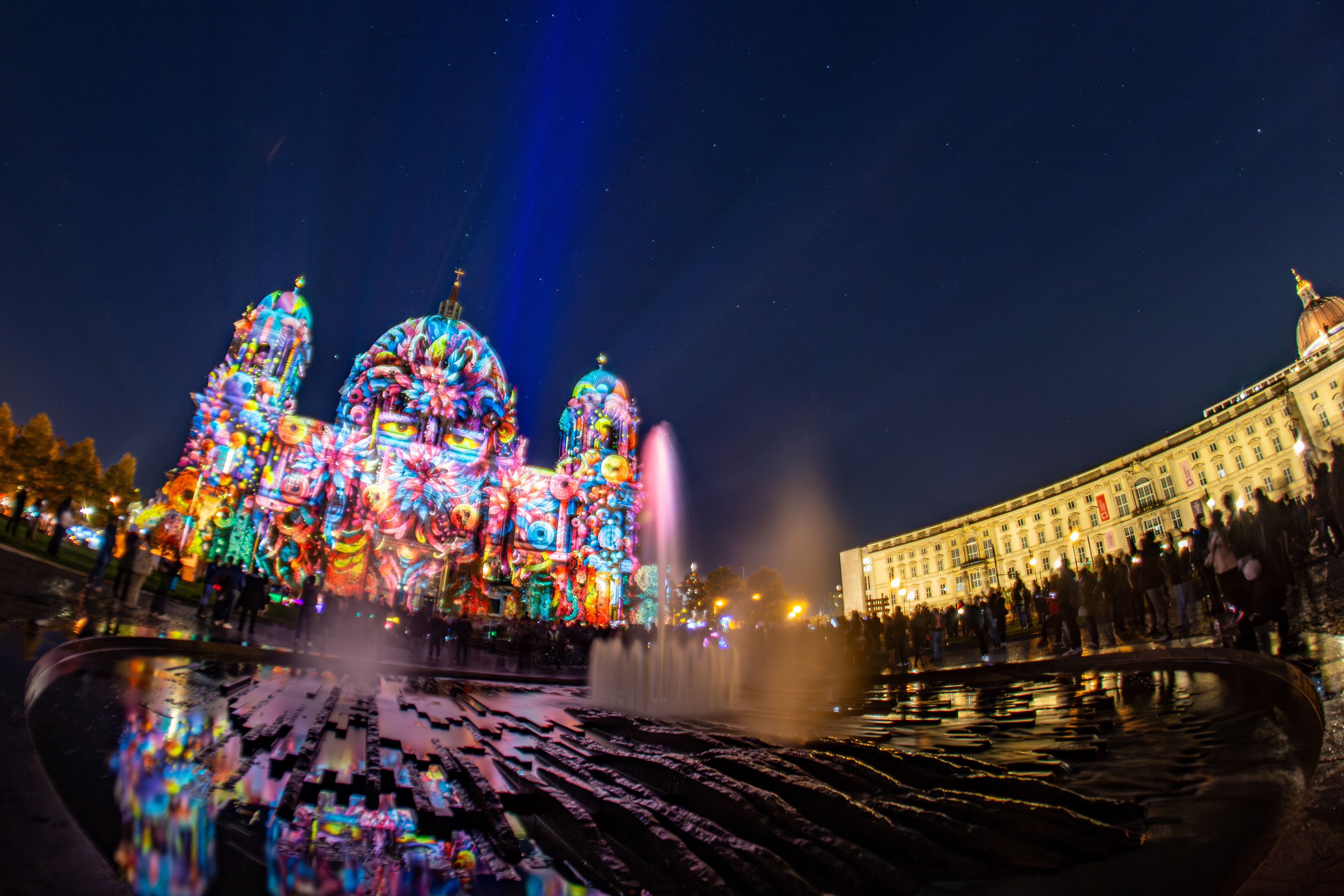 The image captures a serene night scene in Berlin, Germany, with the Berliner Sky Tower prominently displayed against a dark blue sky. The tower, illuminated in blue, stands tall on the left side of the frame, with its spire reaching towards the sky. The Berliner River, reflecting the city's lights, flows on the right side of the image. The buildings, mostly dark in color, are illuminated by streetlights, creating a warm glow. The perspective is from a high vantage point, looking down on the river and the tower, emphasizing the tower's height and prominence. The image is a beautiful representation of Berlin's skyline at night.