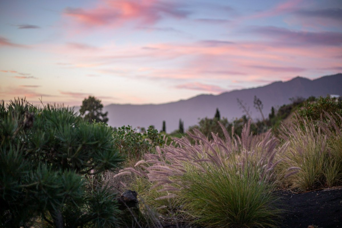 A serene sunset scene features a mountain range in the background, bathed in pink and purple hues. The sky is a mix of orange and pink, with wispy clouds scattered across. In the foreground, a grassy area with green plants and shrubs is visible, adding a touch of nature to the scene. The perspective is from a low angle, looking up at the mountains, emphasizing the grandeur of the landscape. The image does not contain any discernible text or countable objects. The relative positions of the objects suggest a peaceful, natural setting.