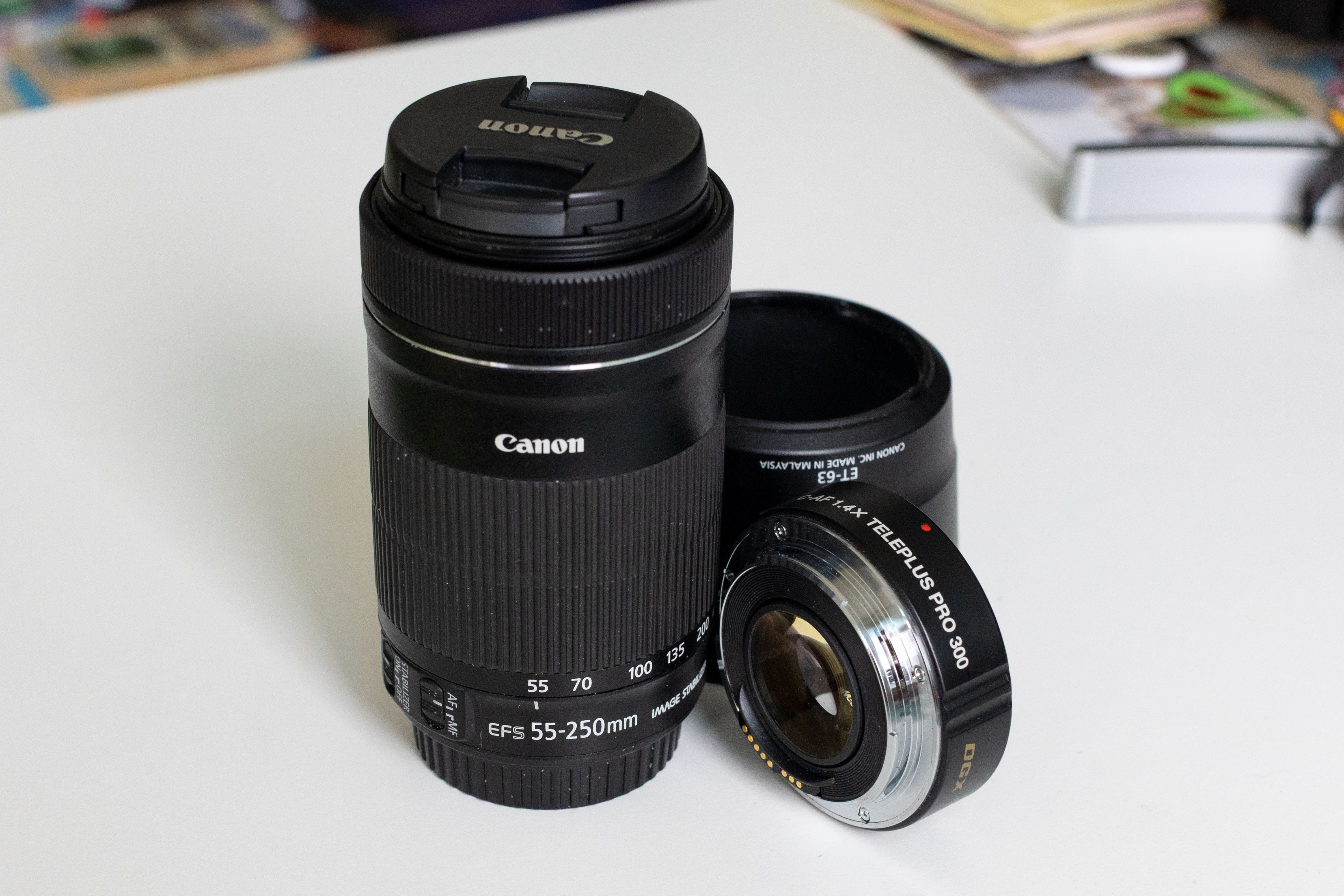 Canon’s own teleconverters are not suitable because of their protruding front optical element, but a third-party Kenko C-AF 1.4× TELEPLUS PRO 300 (which can be found for €50–70) does a satisfactory job of covering the full frame with a 1.6× crop-factor lens, at the cost of one stop of light.