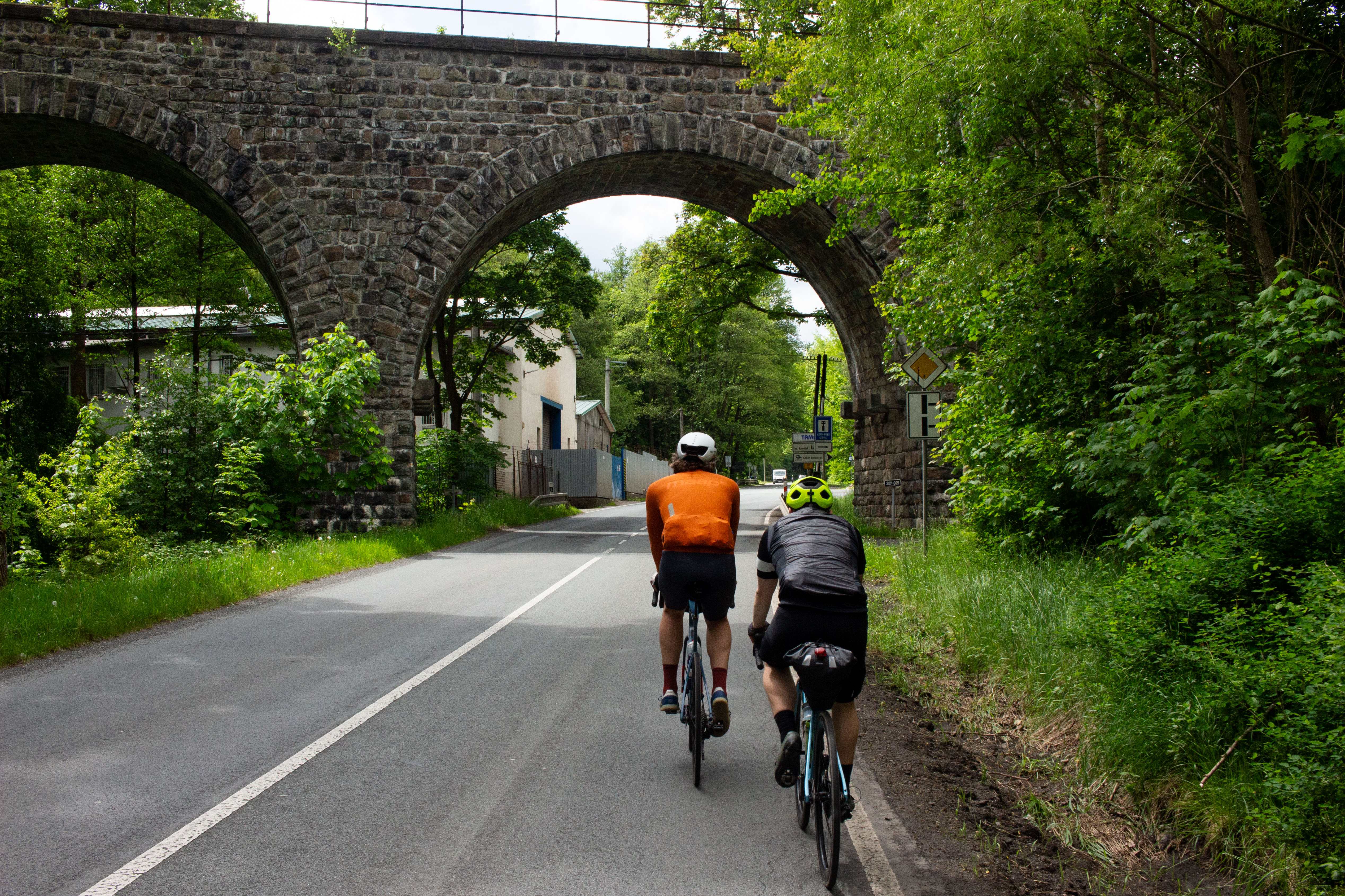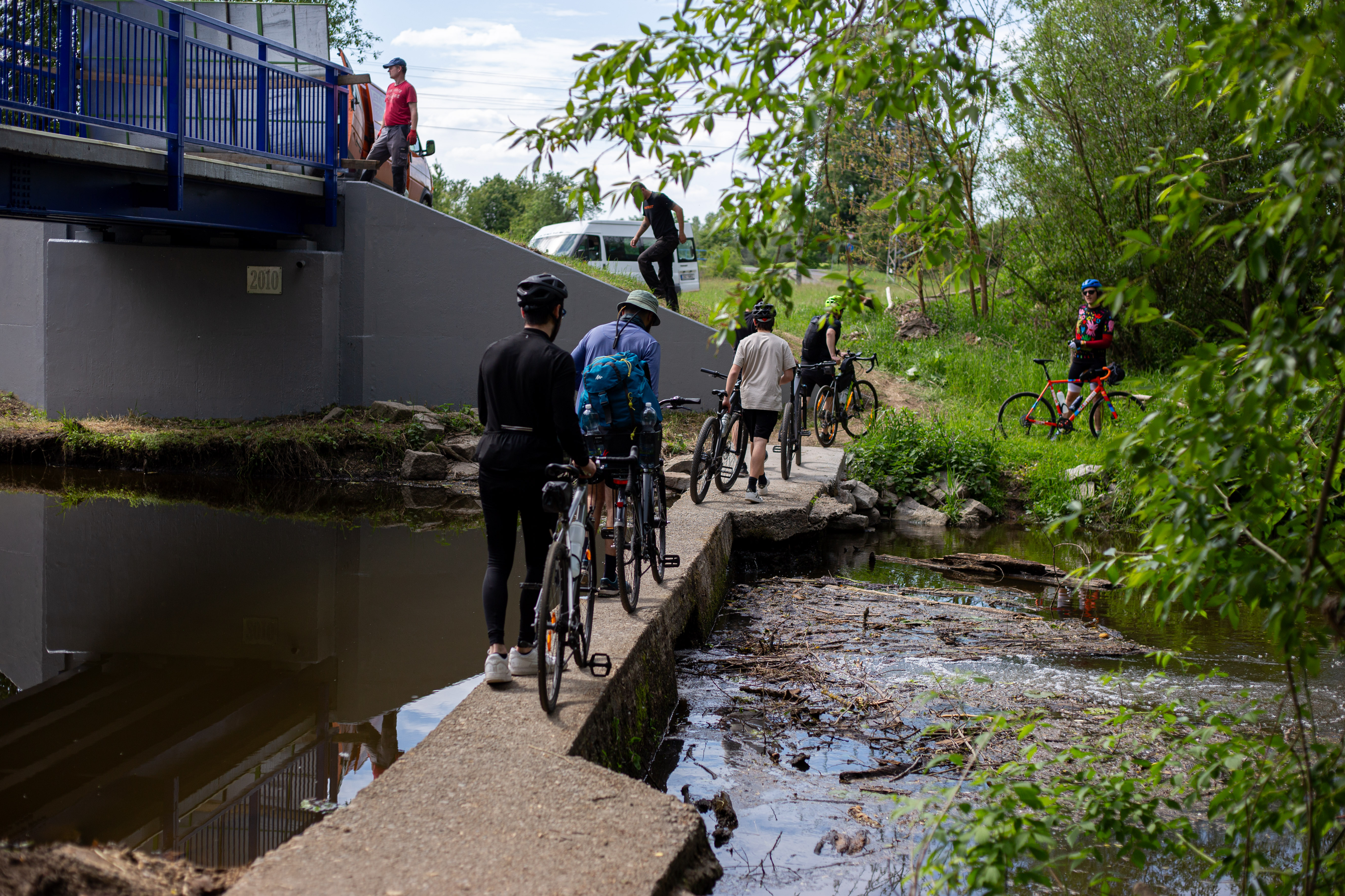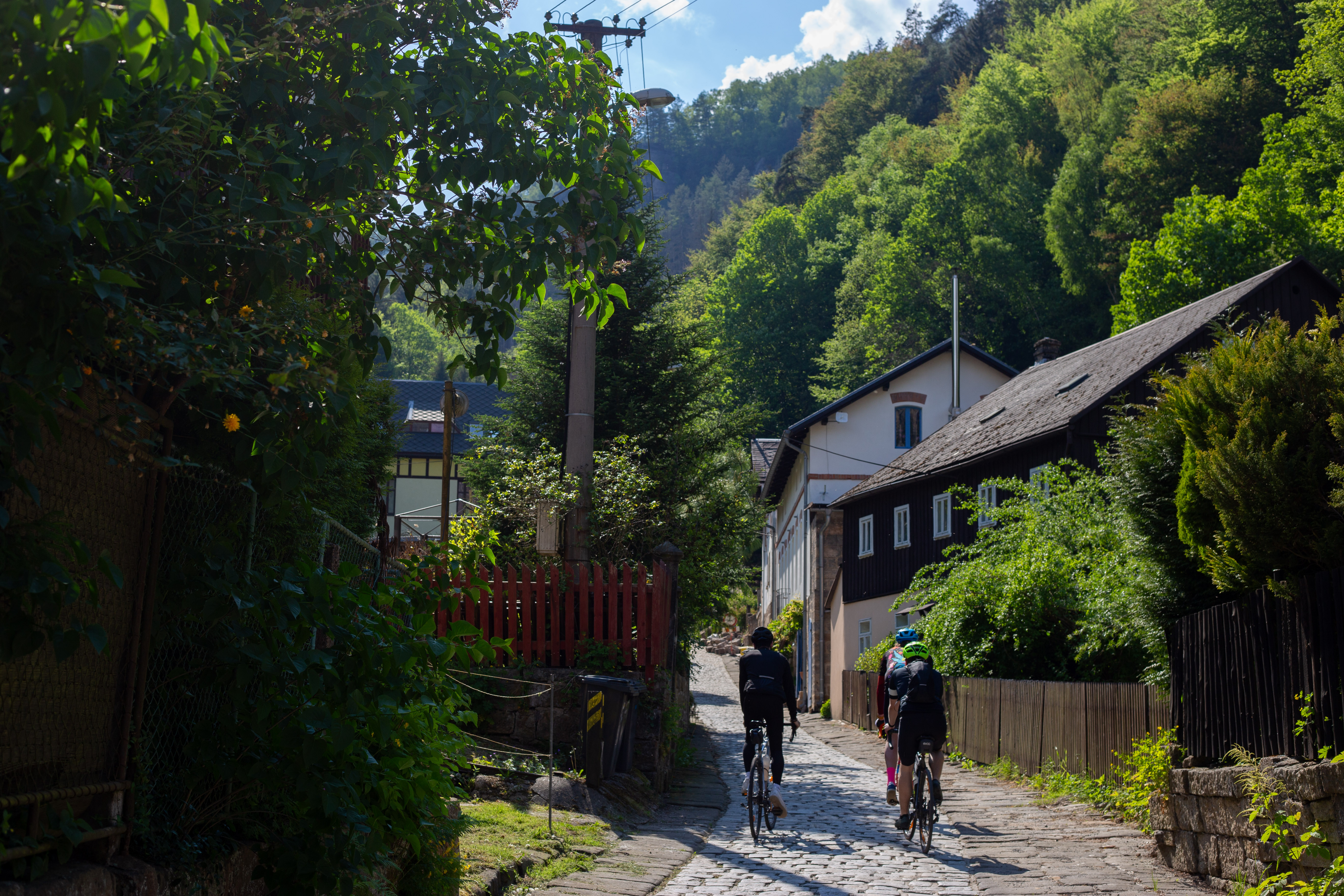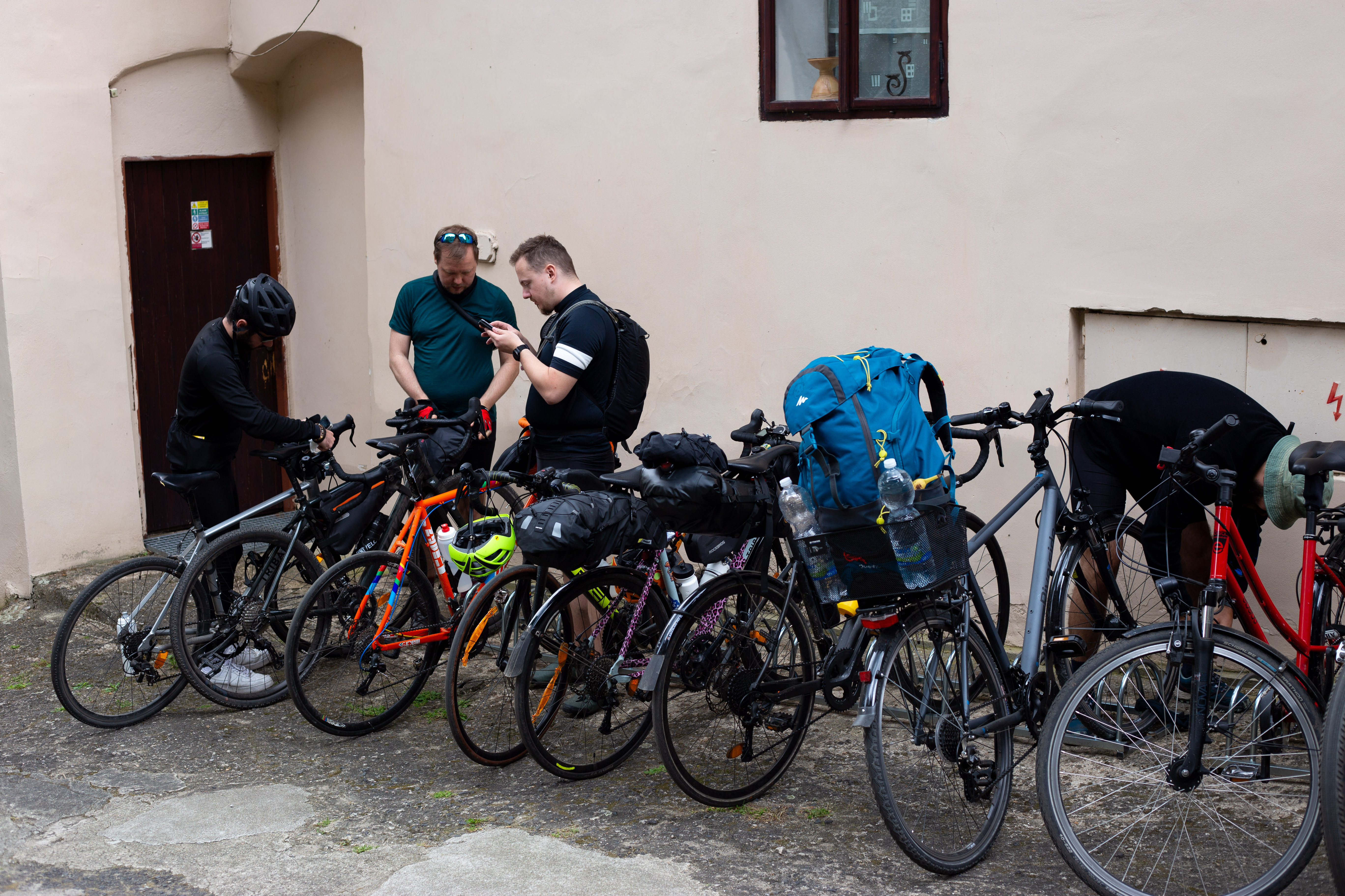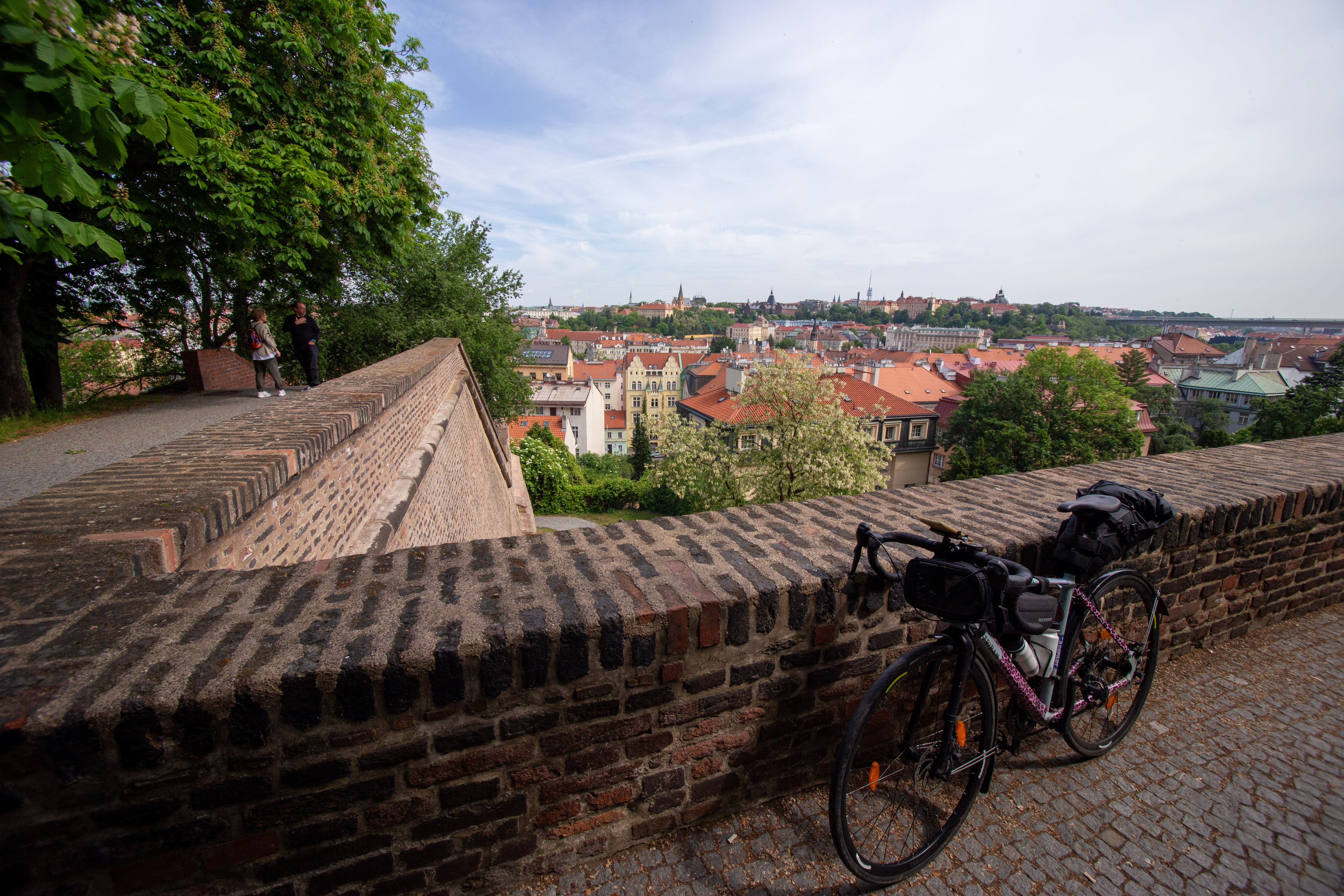 The image features a white building adorned with a unique, moss-covered wall of bicycles, creating a unique and artistic atmosphere. The building has a sign that reads "Vilničáská a říčáská" and "Vilničáská a říčáská" in Czech, indicating the building's location in the Czech Republic. The perspective of the image is from a low angle, emphasizing the height of the building and the bicycles. In the foreground, there are parked cars and a white car, adding to the urban setting. The image captures a blend of nature and urban life, with the bicycle wall serving as a unique and artistic landmark.