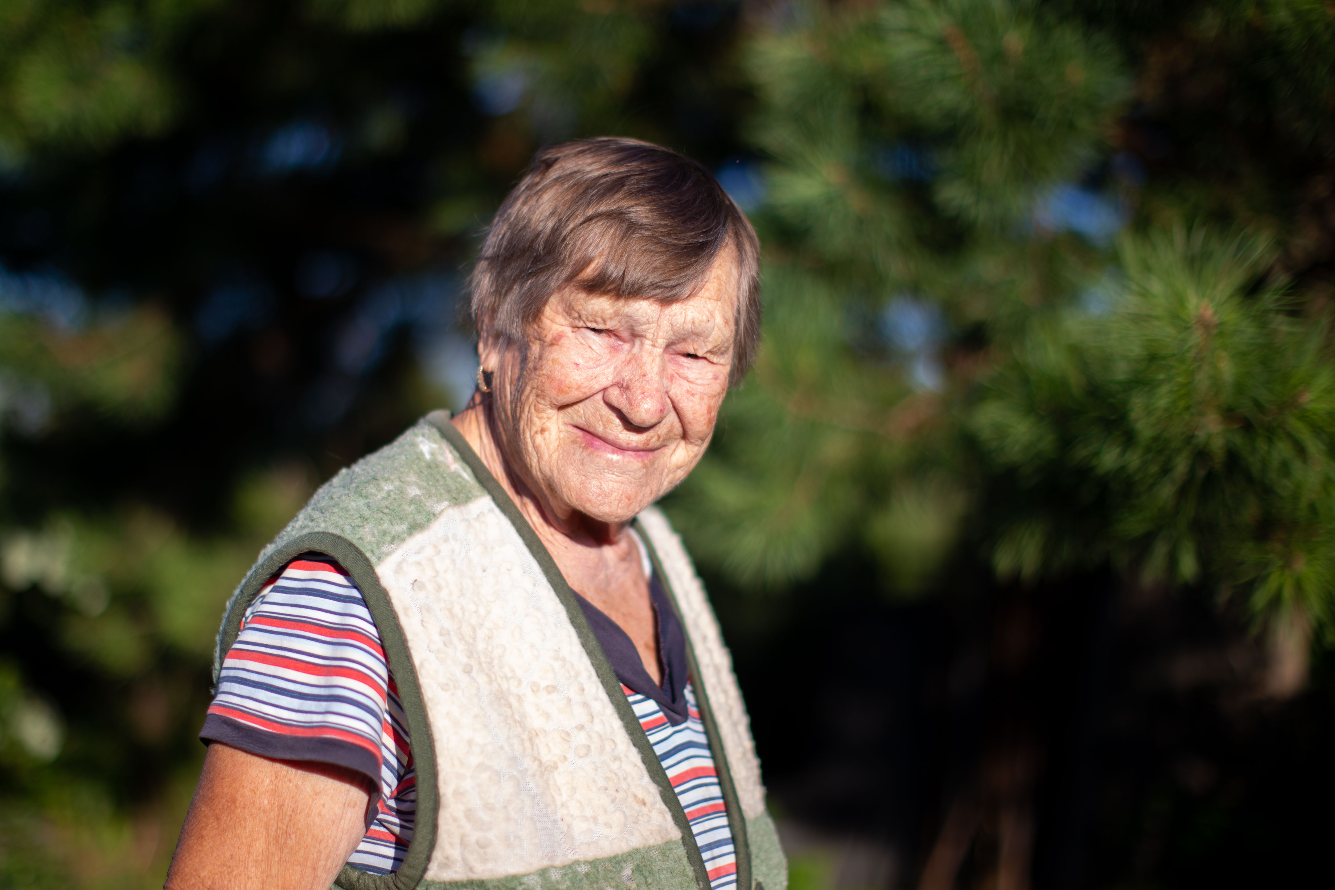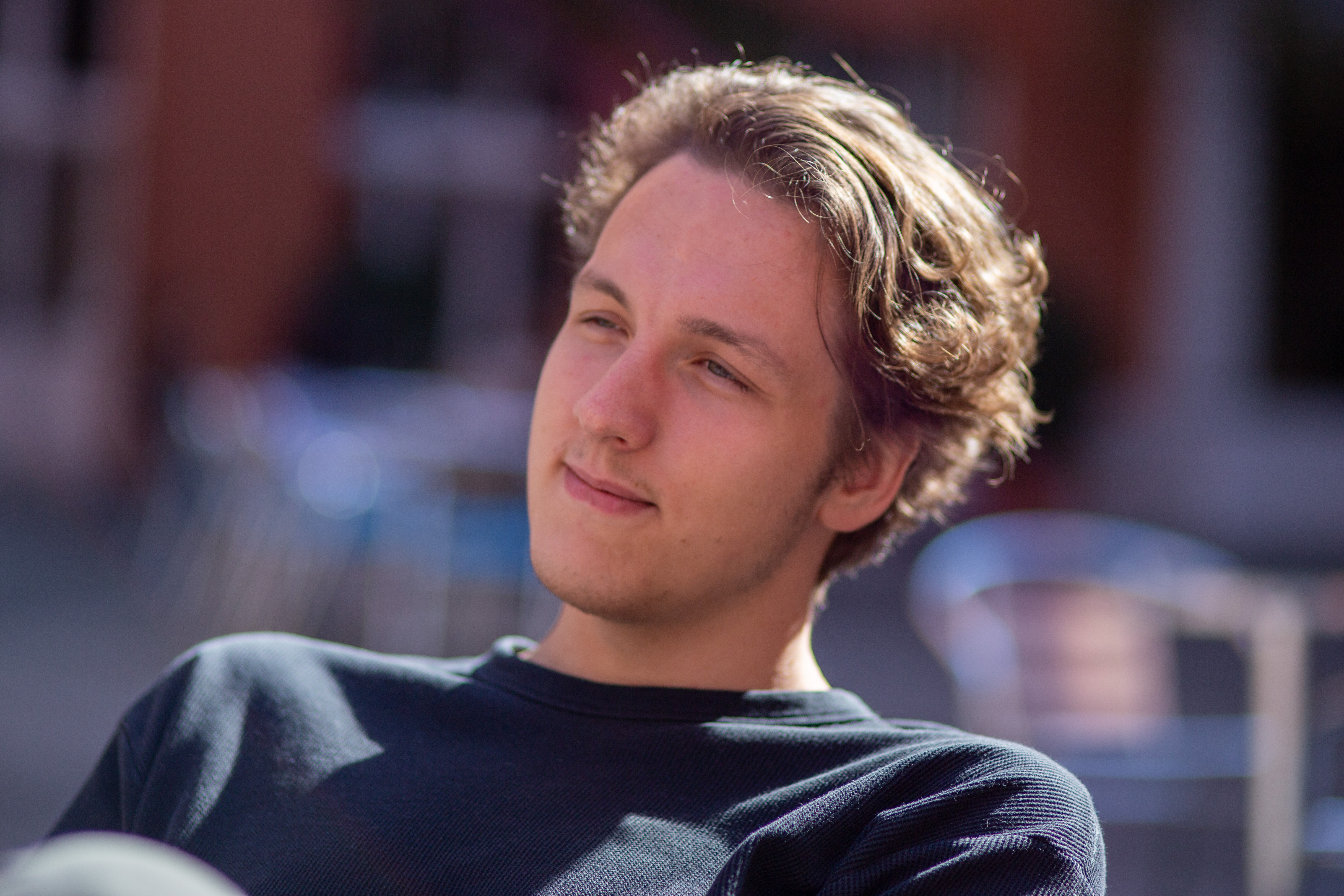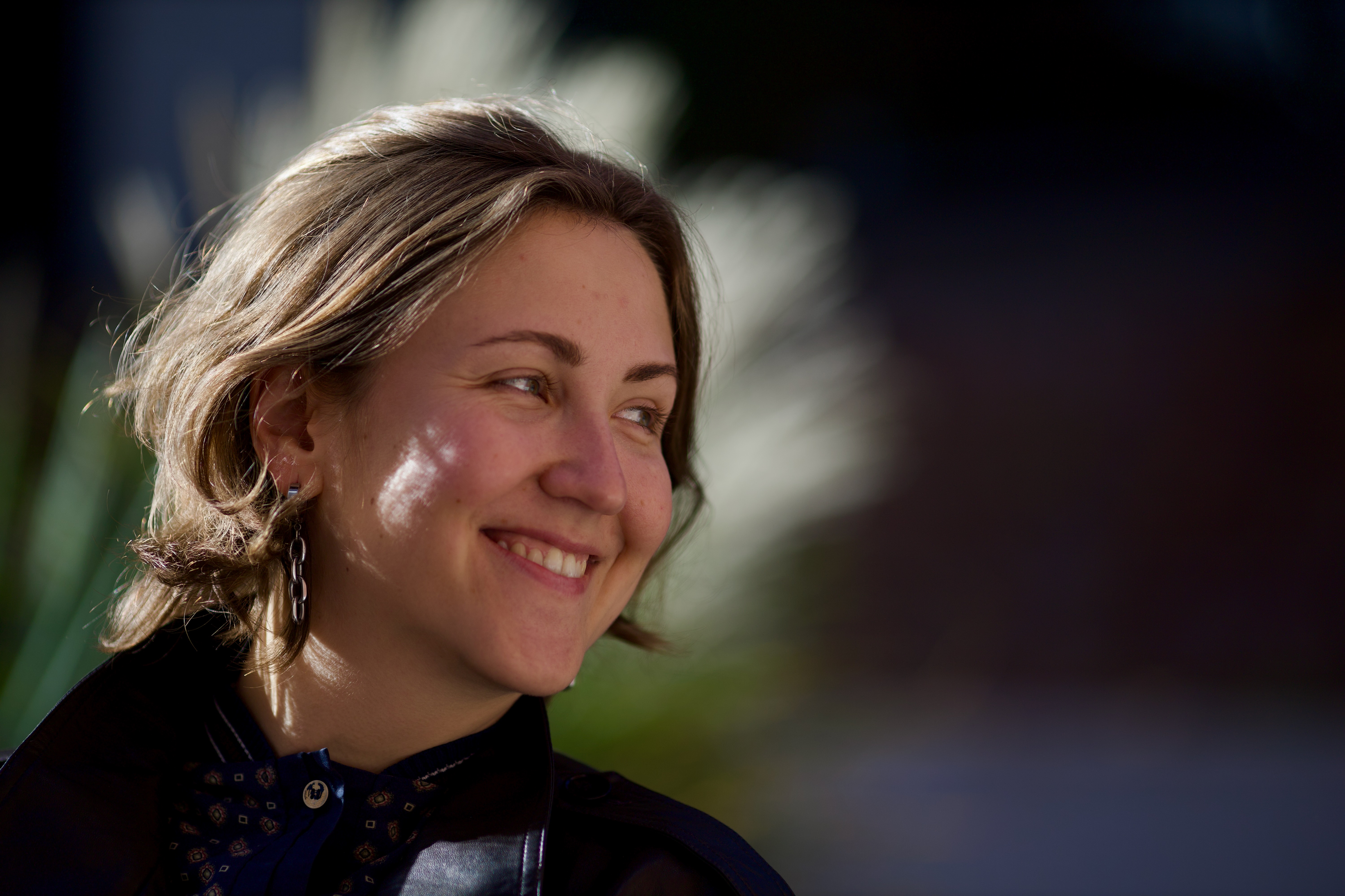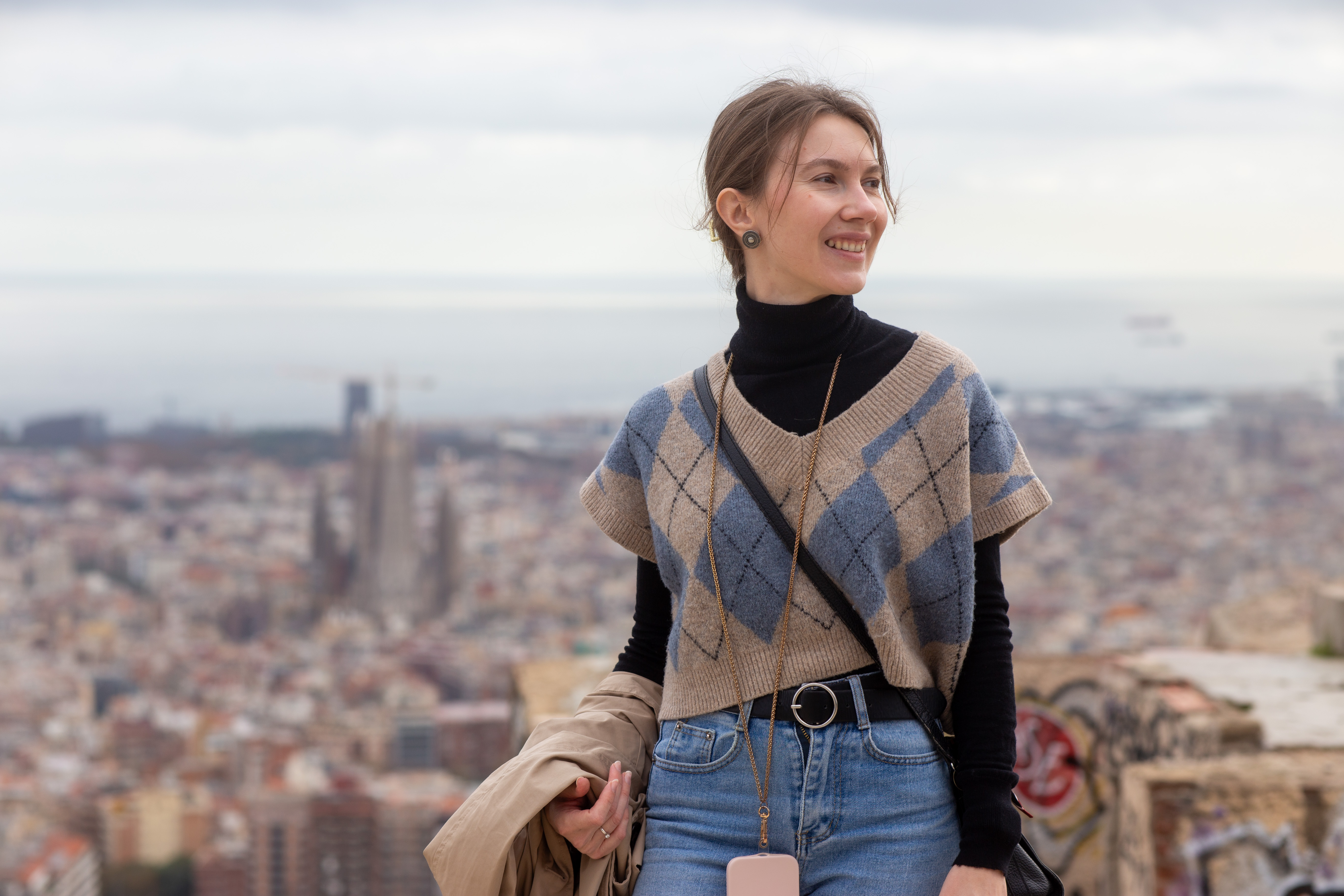 In this image, actress Emma Stone is captured in a moment of tranquility amidst a bustling cityscape. She stands on a ledge, her gaze directed upwards towards the city skyline. Dressed in a blue and beige sweater, a black turtleneck, and blue jeans, she exudes a sense of calm and solitude. A beige purse is slung over her shoulder, and a pair of earrings adorns her ears. Her hair is styled in a loose bun, and she smiles, adding a touch of warmth to the scene. The cityscape in the background is a mix of buildings and trees, creating a dynamic backdrop for her serene moment.