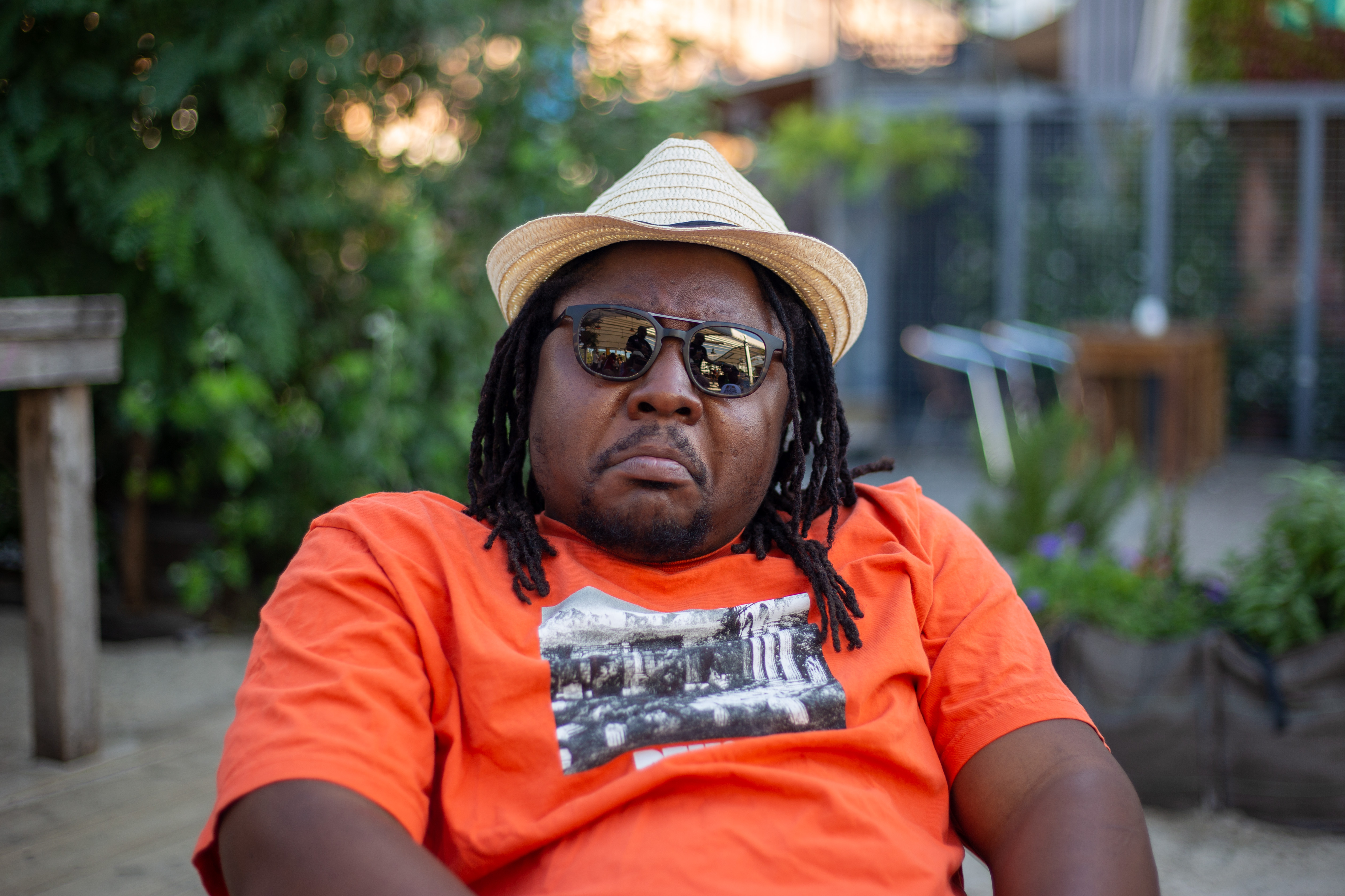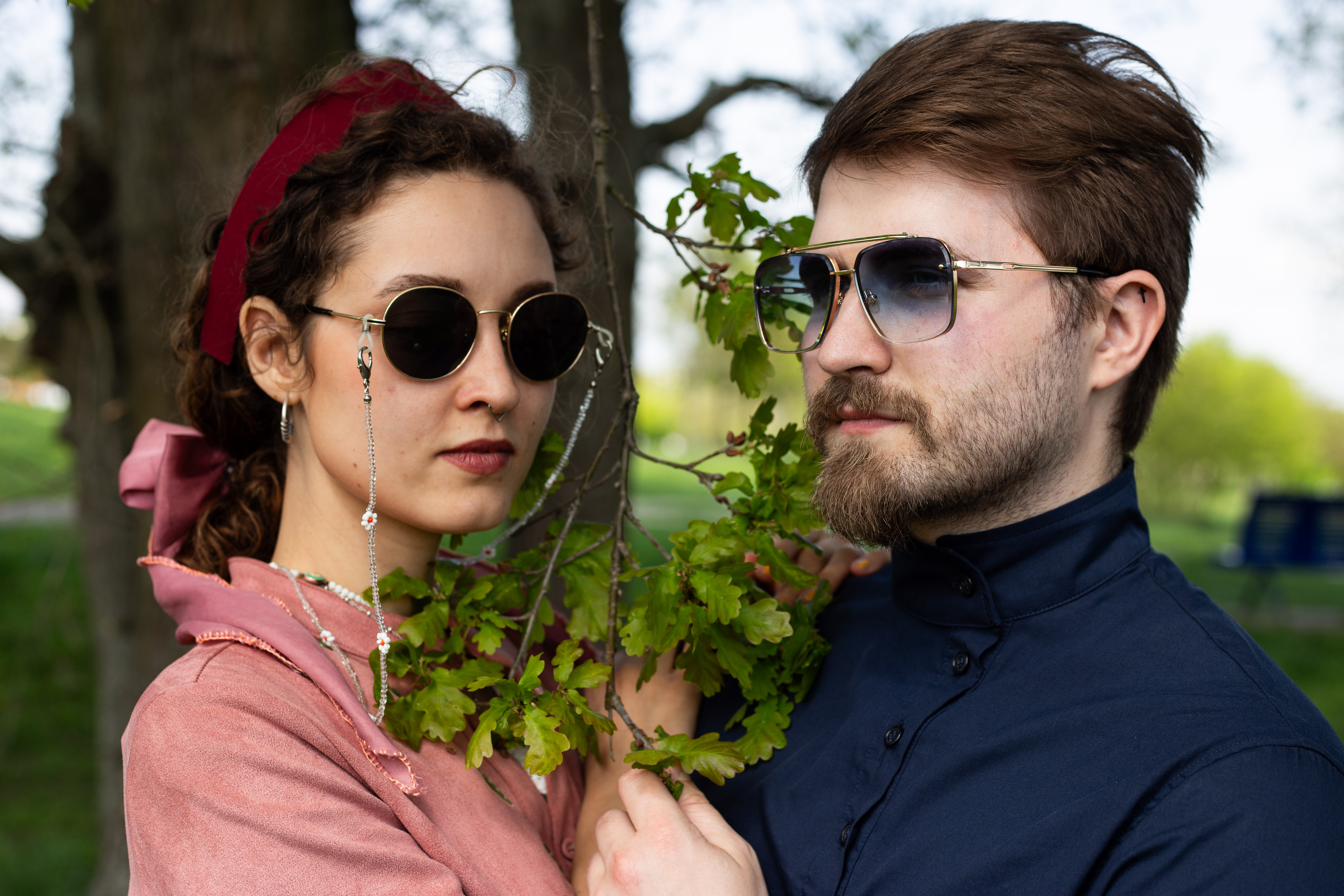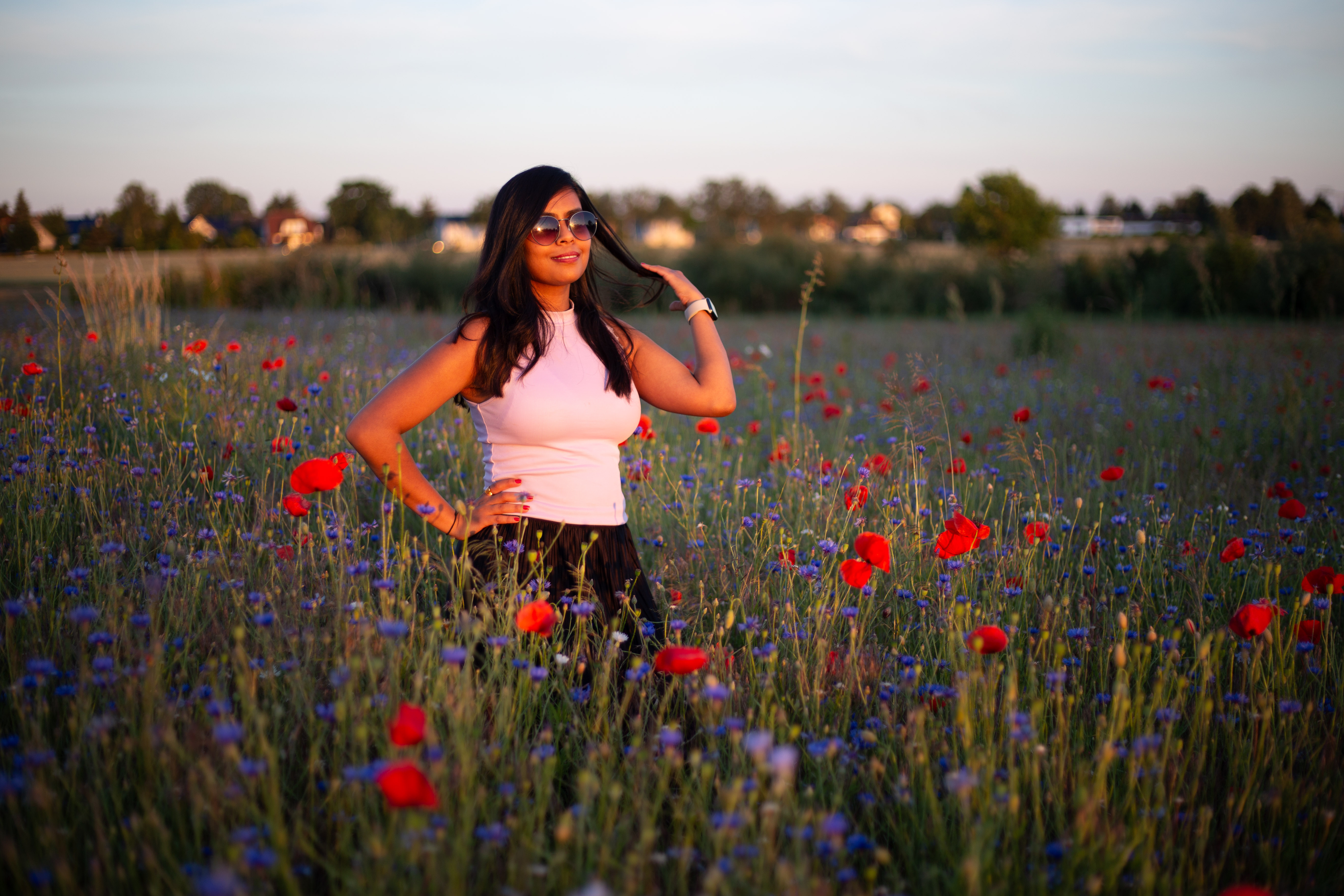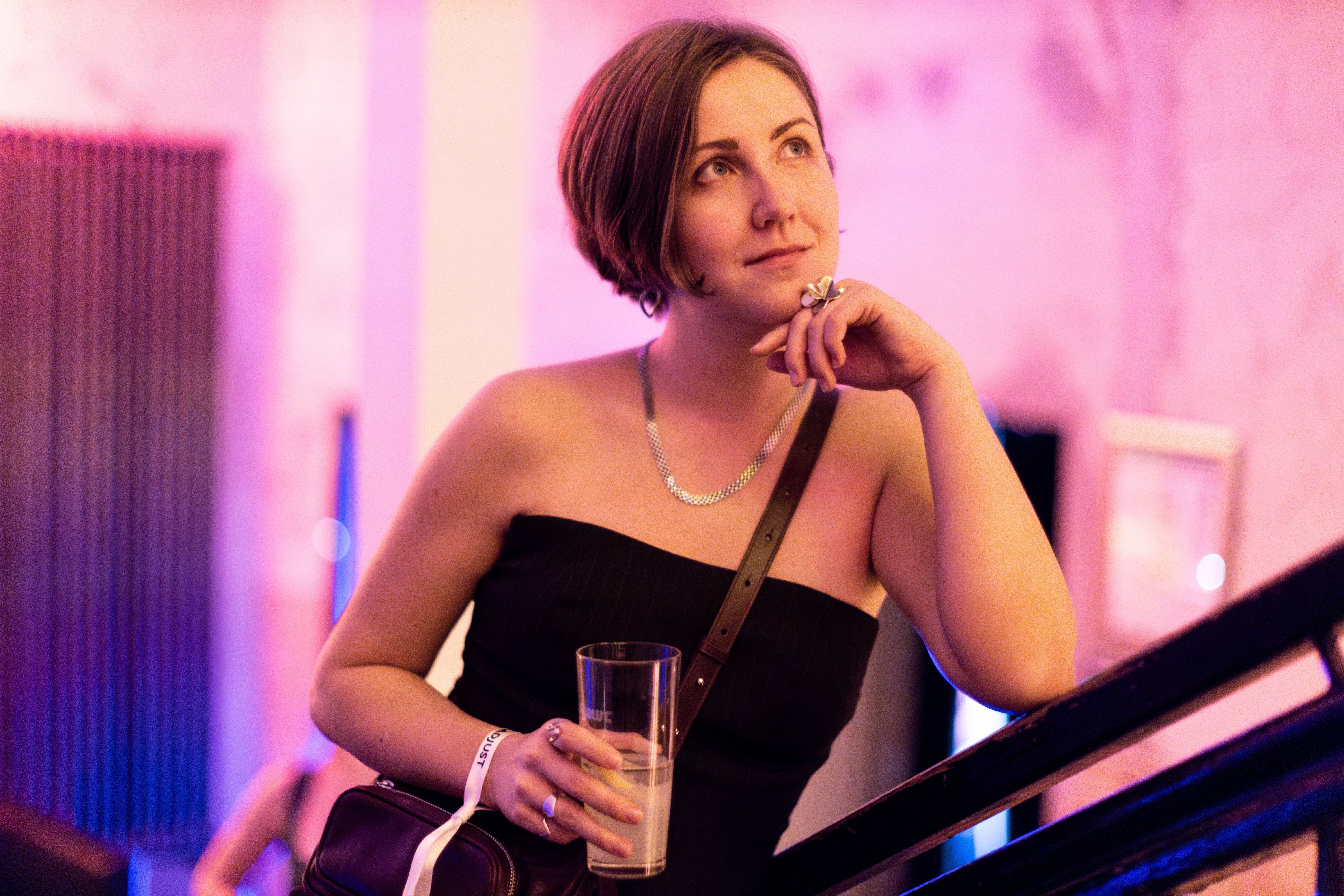 In this image, actress Emma Stone is captured in a moment of tranquility amidst a bustling cityscape. She stands on a ledge, her gaze directed upwards towards the city skyline. Dressed in a blue and beige sweater, a black turtleneck, and blue jeans, she exudes a sense of calm and solitude. A beige purse is slung over her shoulder, and a pair of earrings adorns her ears. Her hair is styled in a loose bun, and she smiles, adding a touch of warmth to the scene. The cityscape in the background is a mix of buildings and trees, creating a dynamic backdrop for her serene moment.