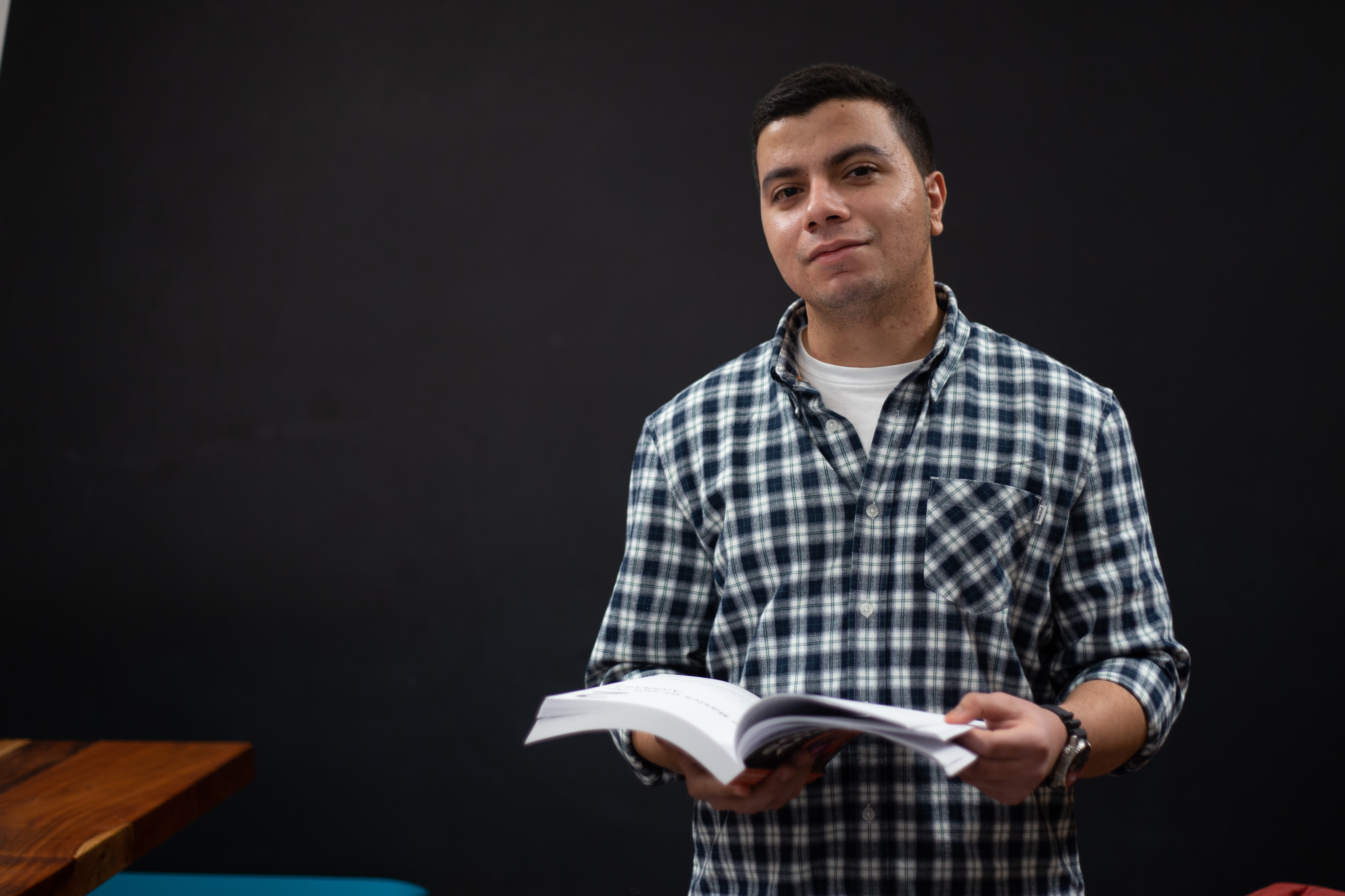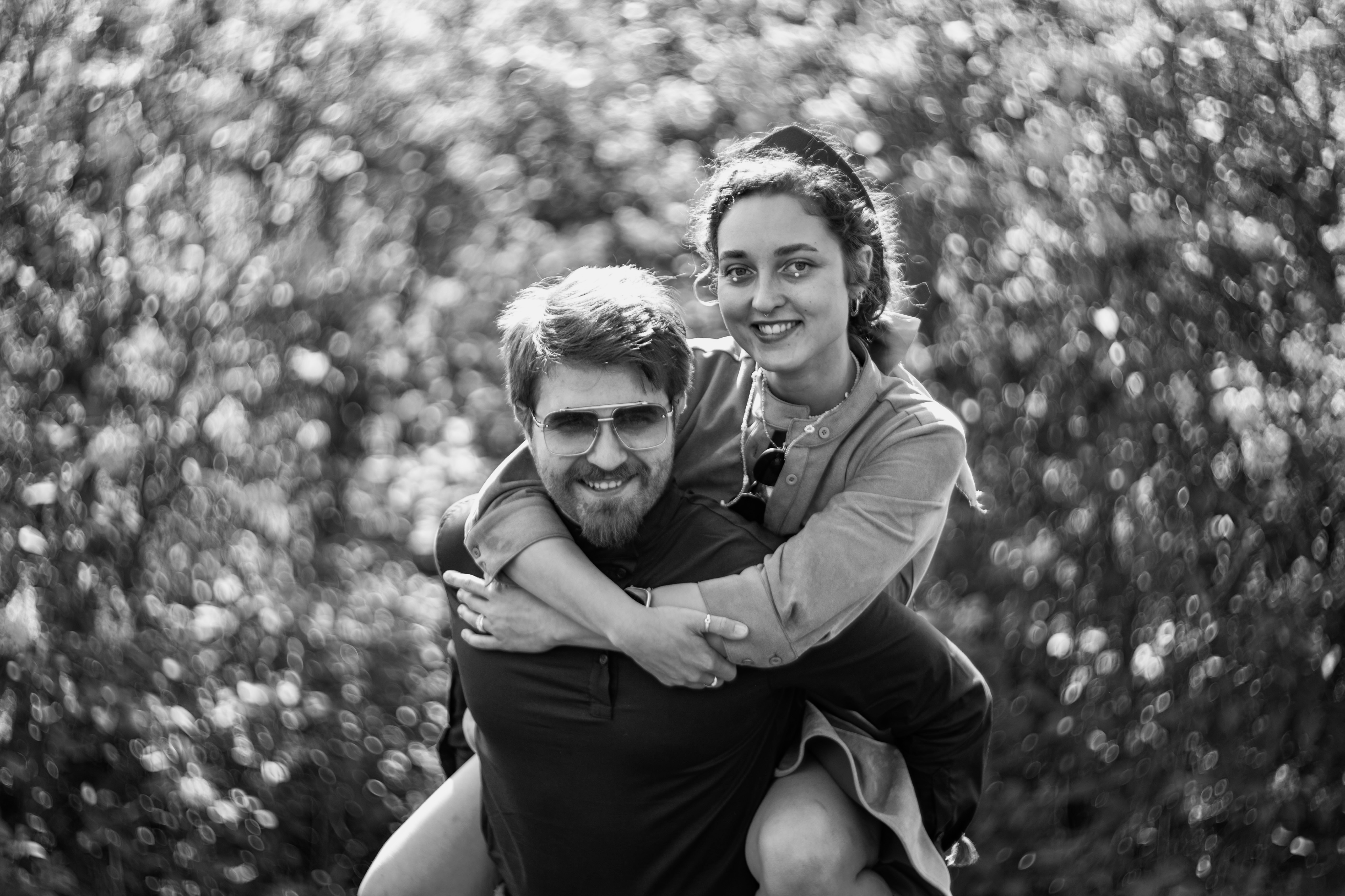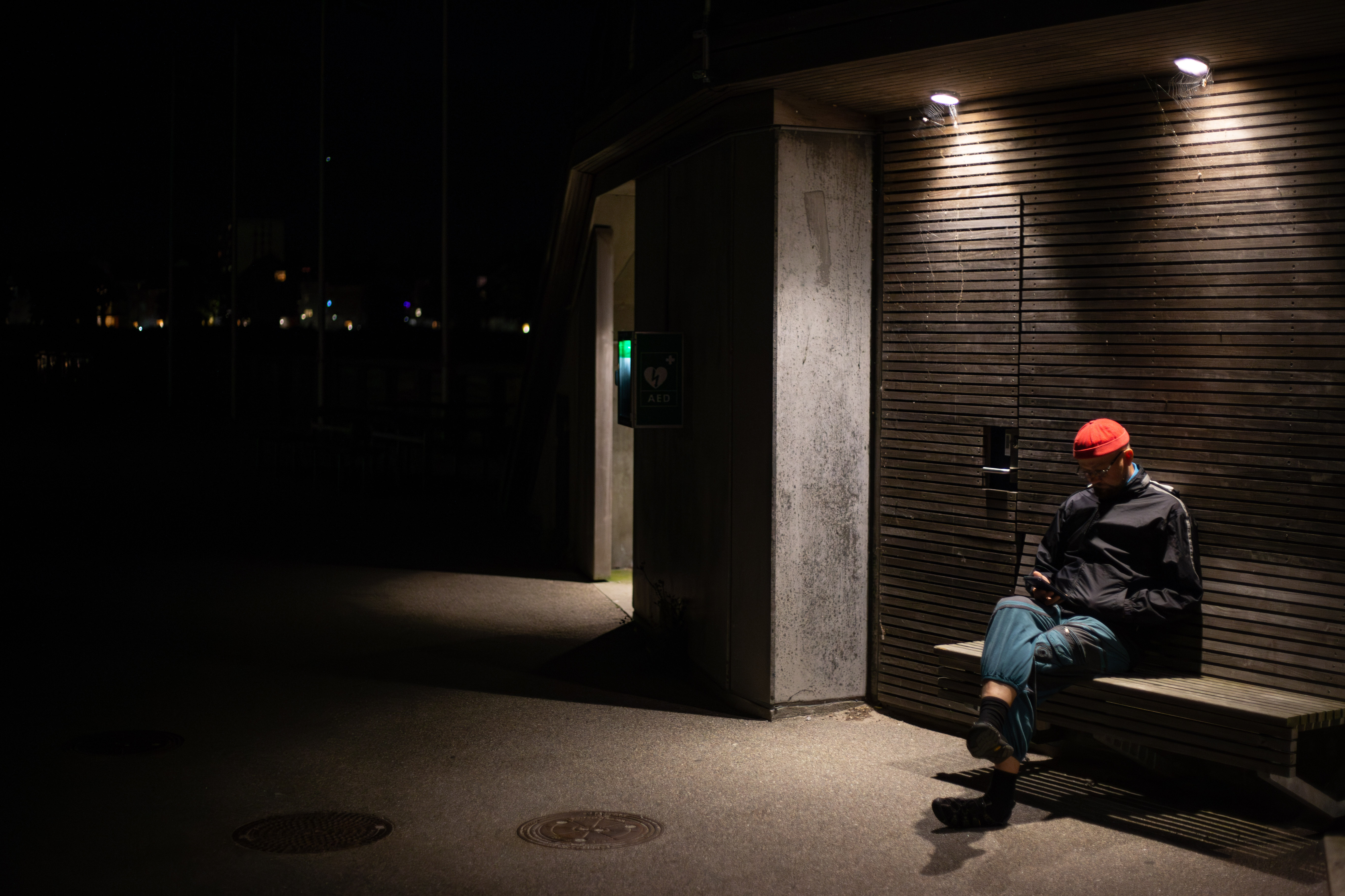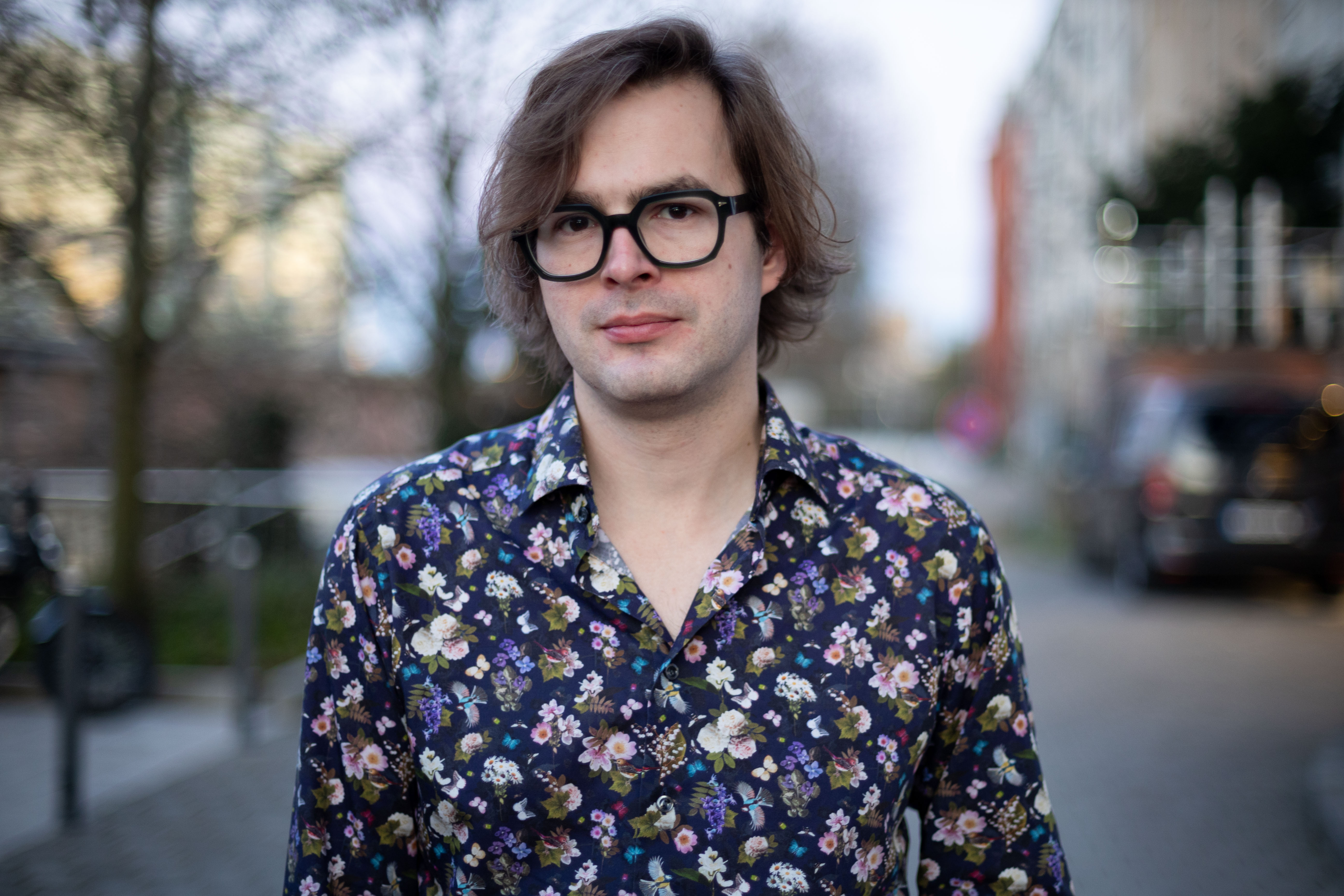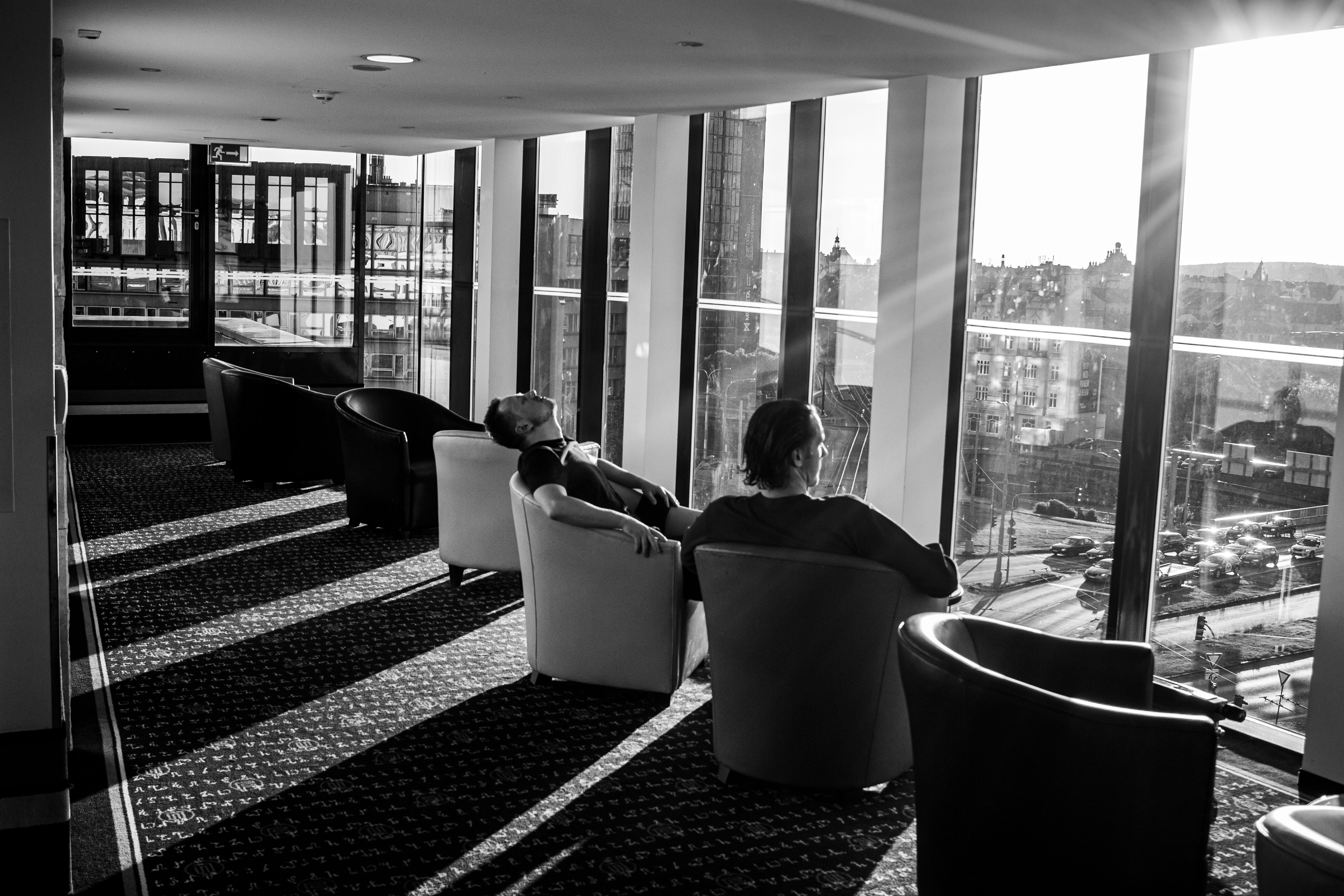 In this image, actress Emma Stone is captured in a moment of tranquility amidst a bustling cityscape. She stands on a ledge, her gaze directed upwards towards the city skyline. Dressed in a blue and beige sweater, a black turtleneck, and blue jeans, she exudes a sense of calm and solitude. A beige purse is slung over her shoulder, and a pair of earrings adorns her ears. Her hair is styled in a loose bun, and she smiles, adding a touch of warmth to the scene. The cityscape in the background is a mix of buildings and trees, creating a dynamic backdrop for her serene moment.