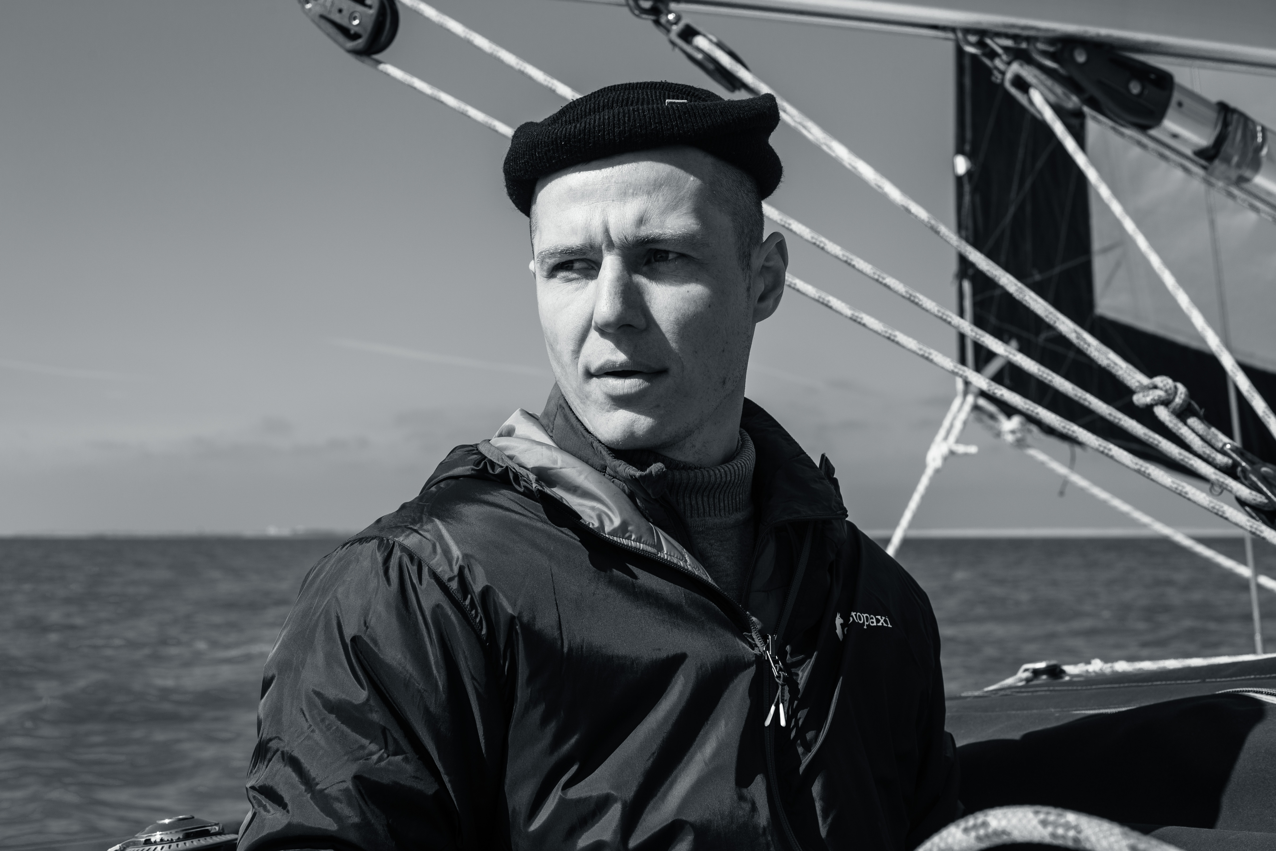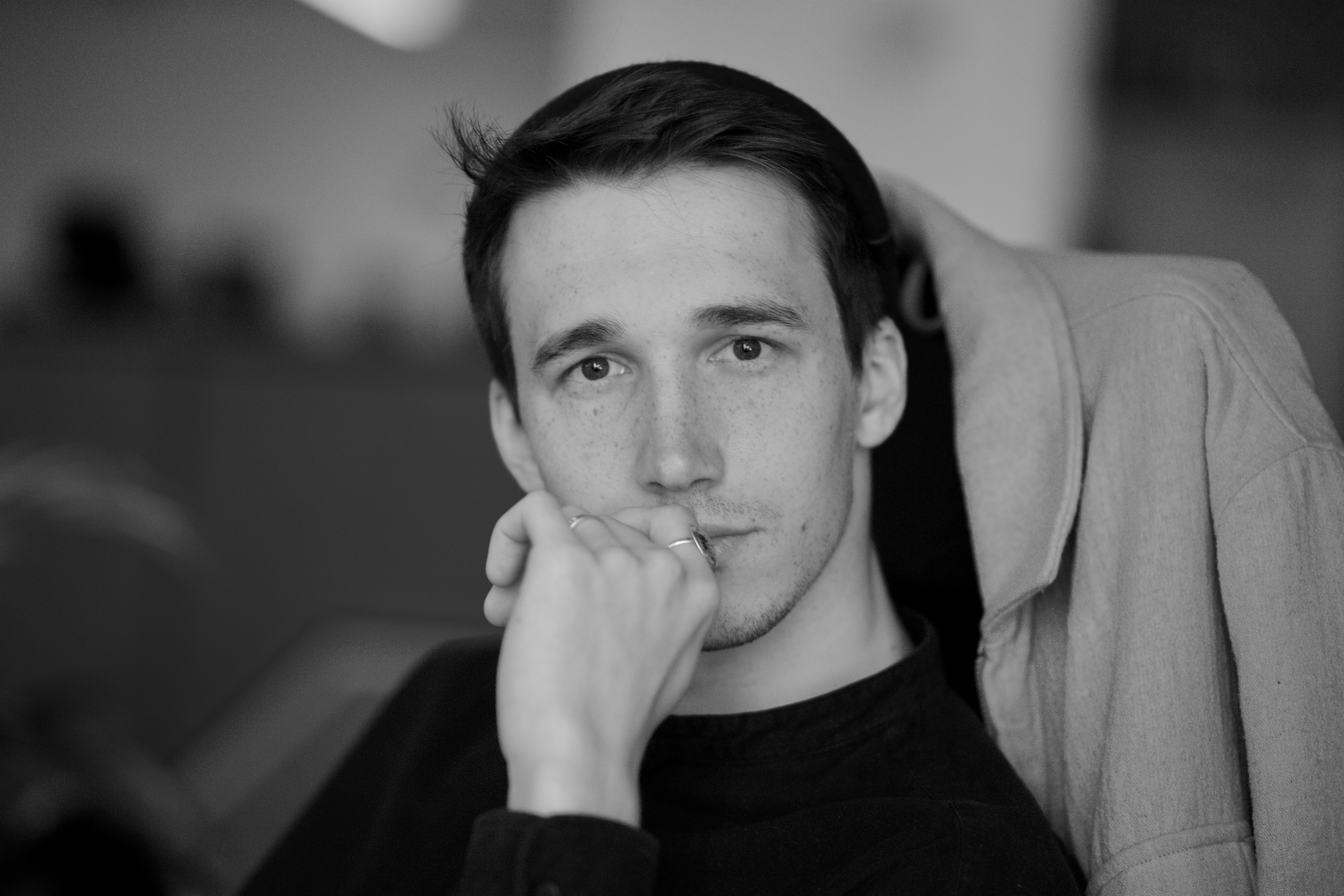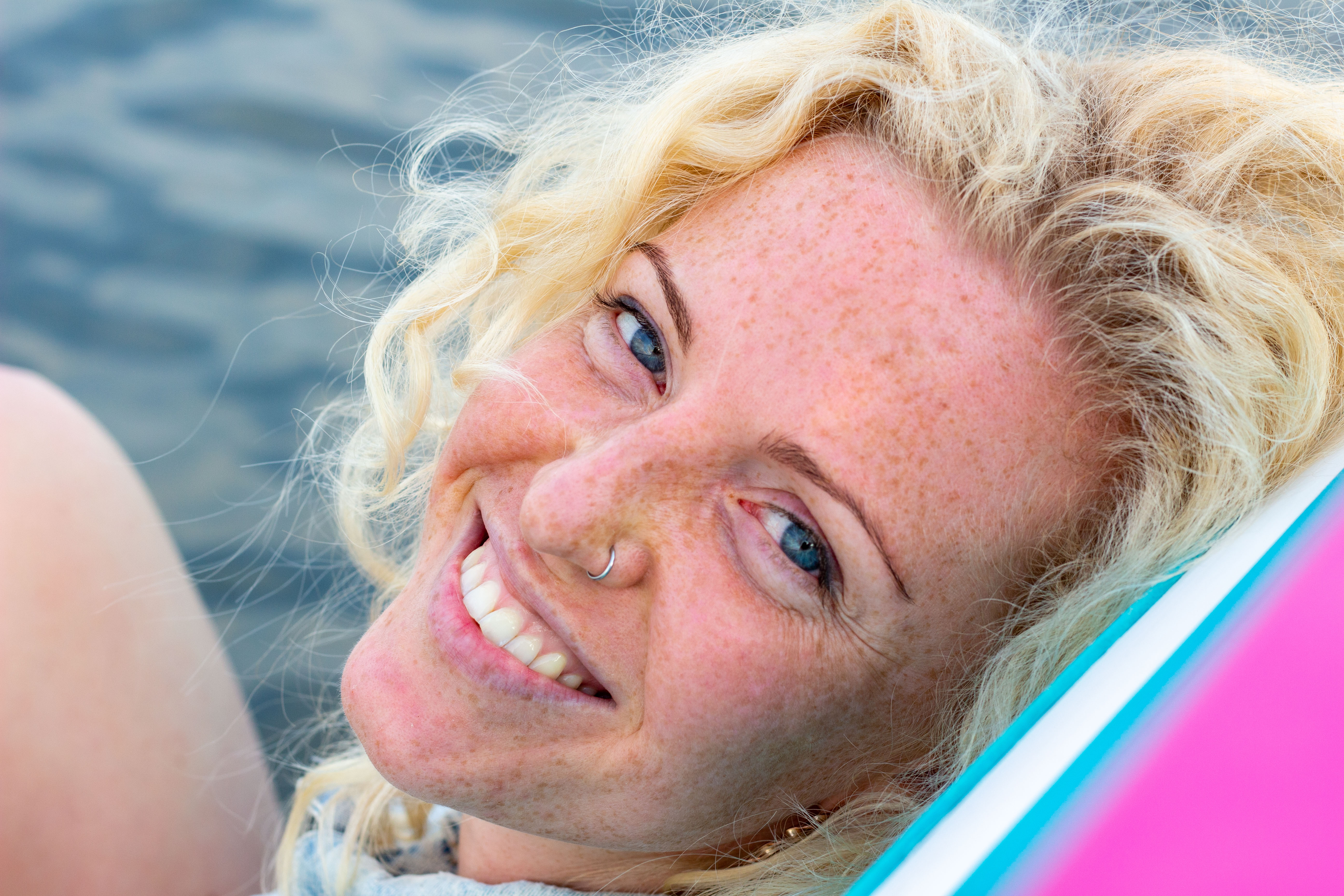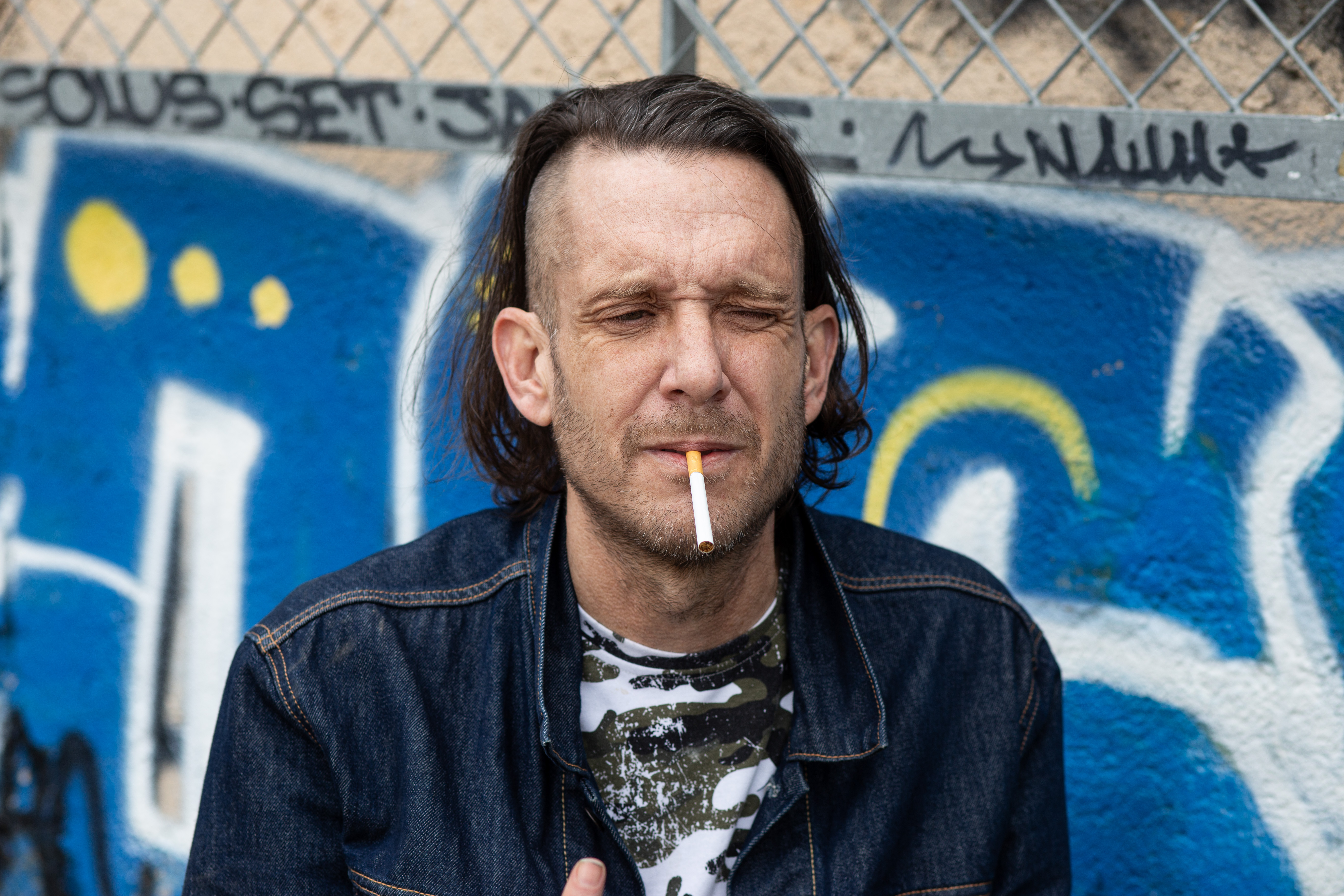 In this image, actress Emma Stone is captured in a moment of tranquility amidst a bustling cityscape. She stands on a ledge, her gaze directed upwards towards the city skyline. Dressed in a blue and beige sweater, a black turtleneck, and blue jeans, she exudes a sense of calm and solitude. A beige purse is slung over her shoulder, and a pair of earrings adorns her ears. Her hair is styled in a loose bun, and she smiles, adding a touch of warmth to the scene. The cityscape in the background is a mix of buildings and trees, creating a dynamic backdrop for her serene moment.