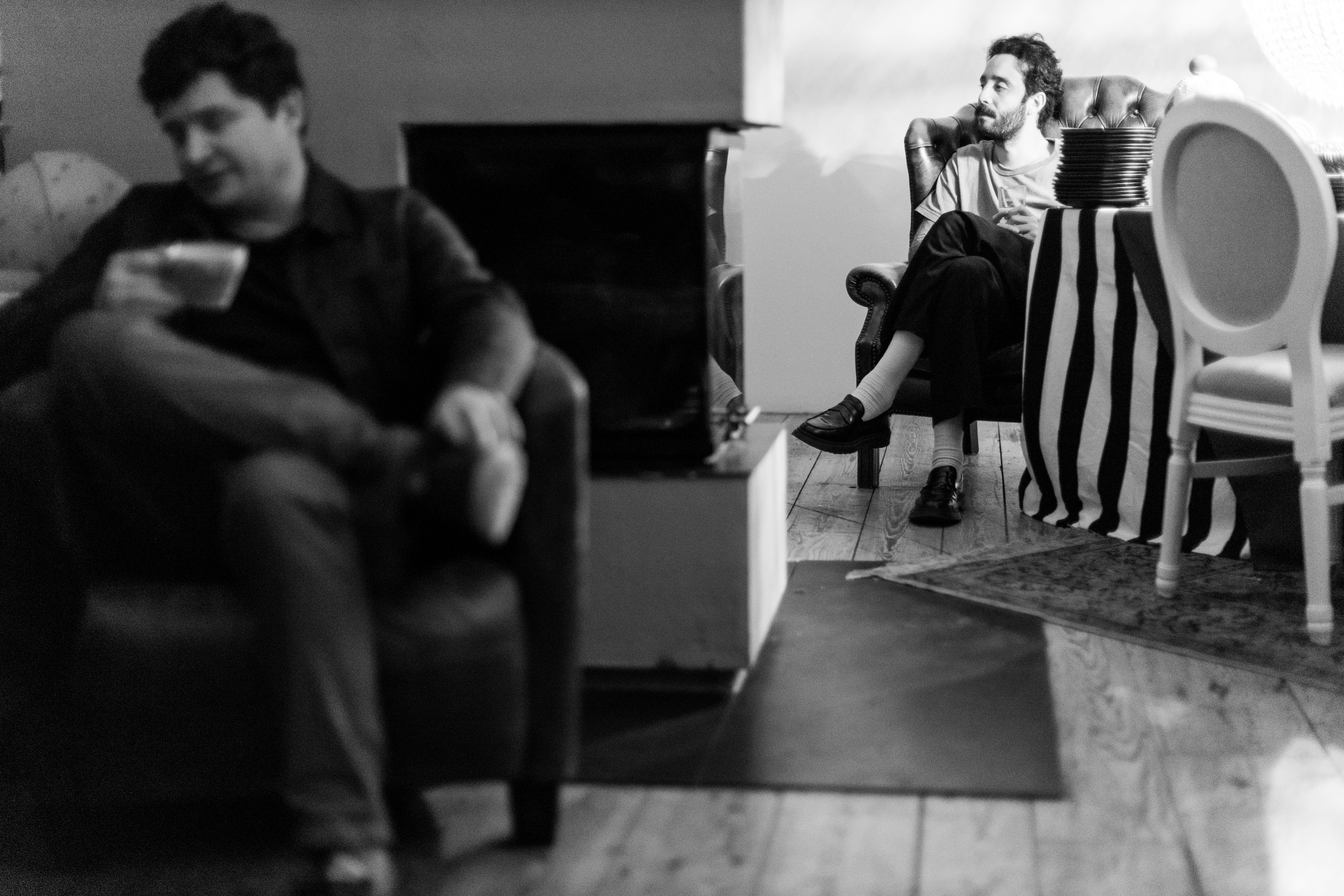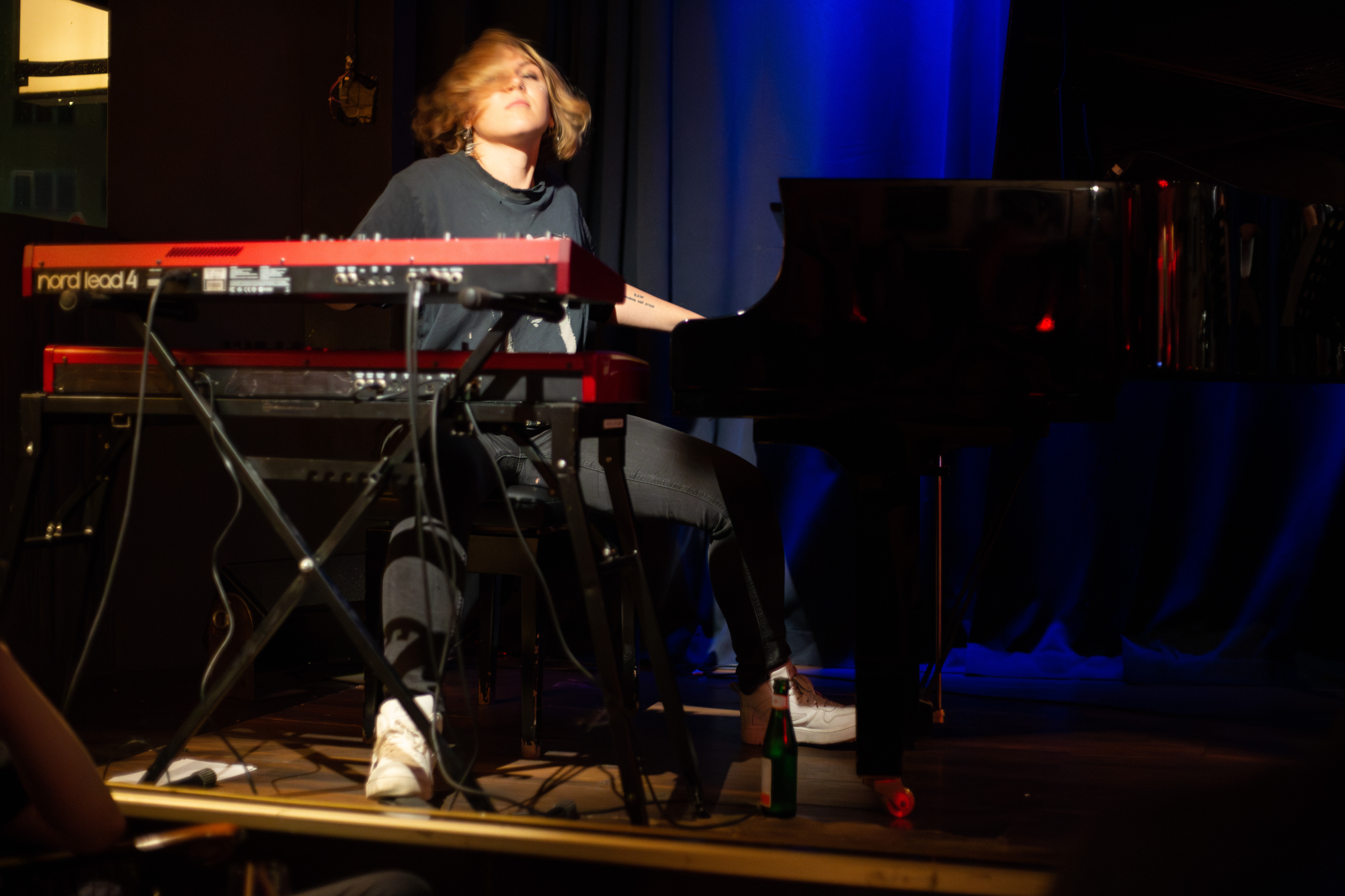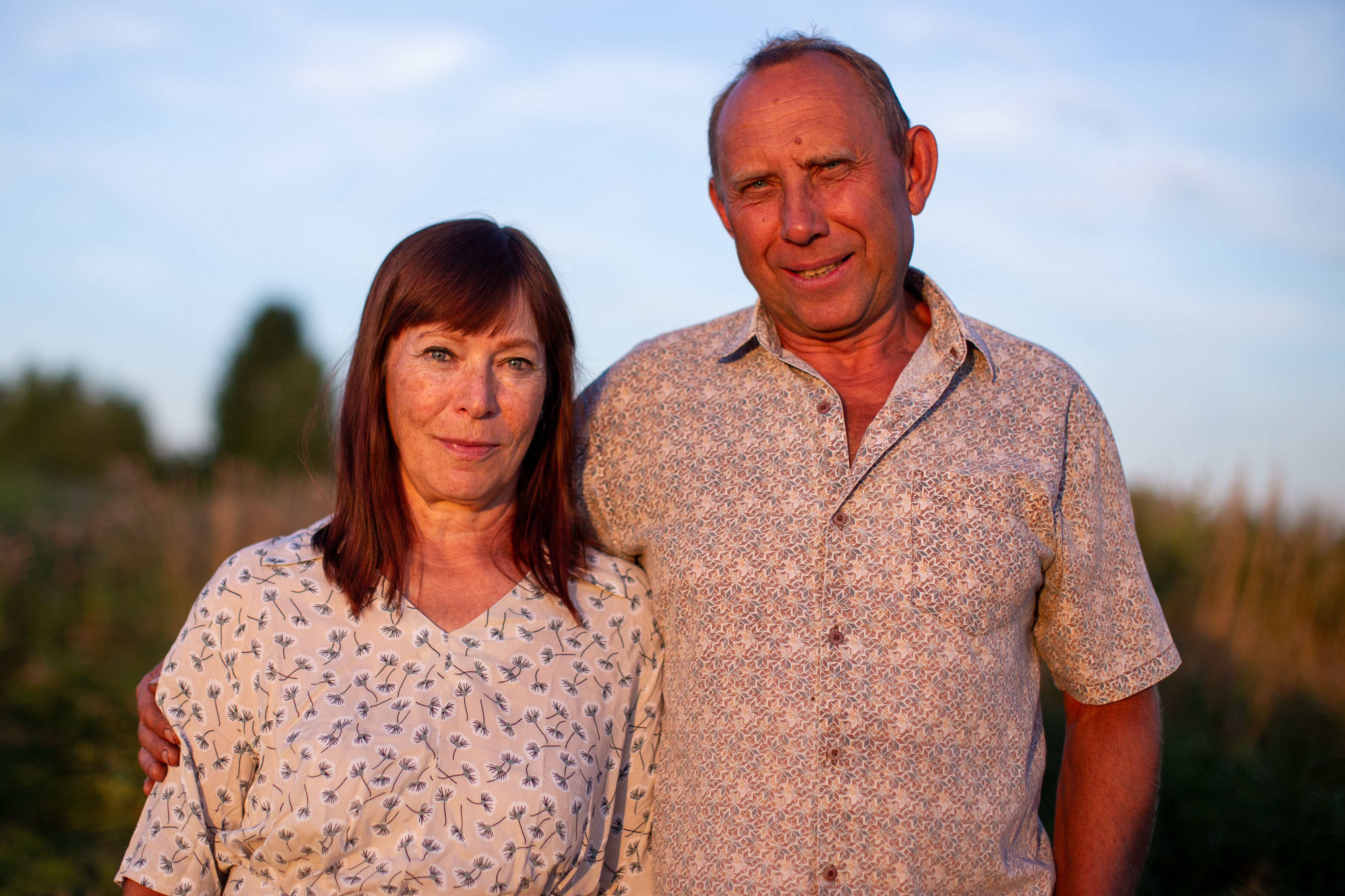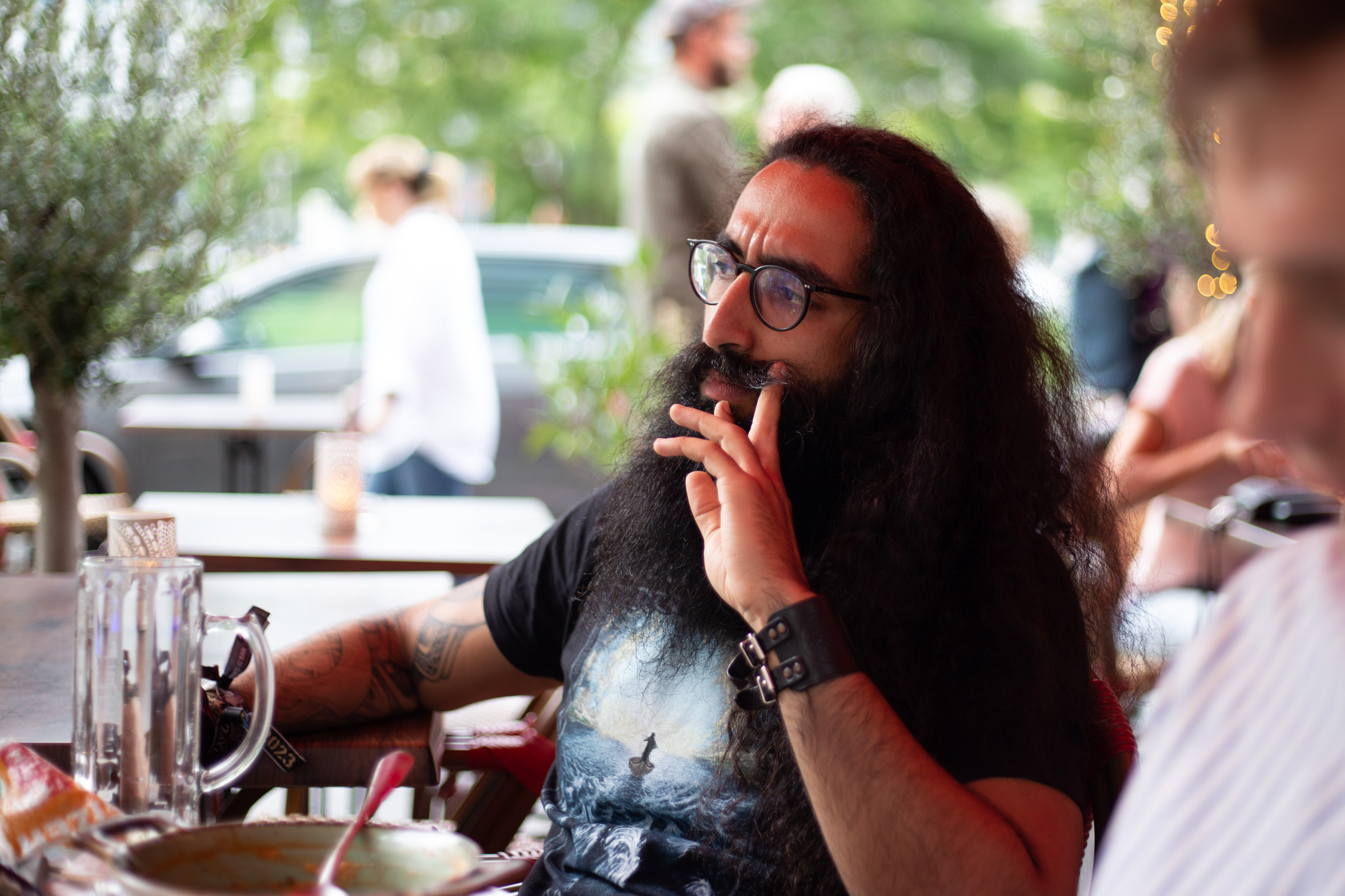 In this image, actress Emma Stone is captured in a moment of tranquility amidst a bustling cityscape. She stands on a ledge, her gaze directed upwards towards the city skyline. Dressed in a blue and beige sweater, a black turtleneck, and blue jeans, she exudes a sense of calm and solitude. A beige purse is slung over her shoulder, and a pair of earrings adorns her ears. Her hair is styled in a loose bun, and she smiles, adding a touch of warmth to the scene. The cityscape in the background is a mix of buildings and trees, creating a dynamic backdrop for her serene moment.